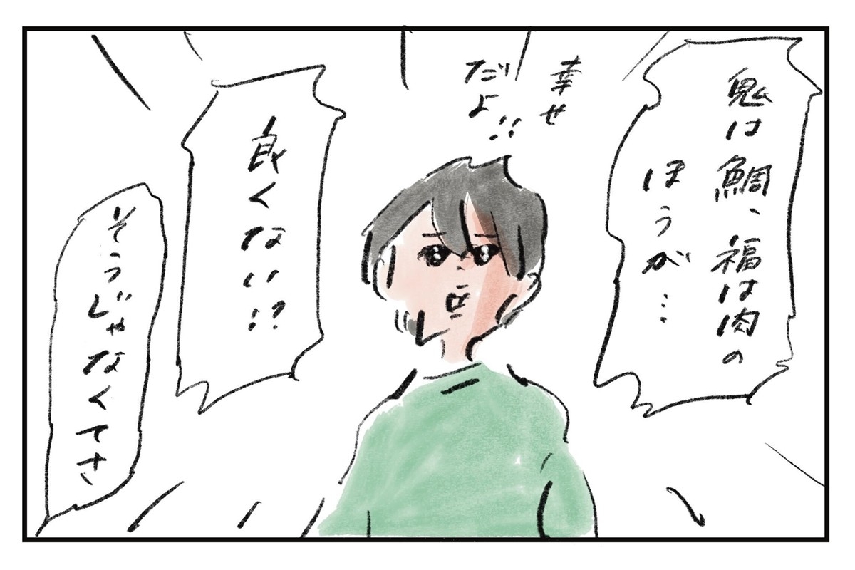 女性自身TOP > コラム > まめ日和 > 鬼は鯛、福は肉『まめ日和』第512回 鬼は鯛、福は肉『まめ日和』第512回 記事投稿日:2026/02/27 06:00 最終更新日:2026/02/27 06:00 よこみねさやか (C)よこみねさやか むしろこの回答に対して“三角”をつけてくれた先生の温情に想いを馳せると泣きたくなります。たしかに惜しくはあるが、全然違う。その後「外」と「内」を死ぬほど練習しました。 記事の続きを読む 出典元:WEB女性自身 【関連画像】 【関連記事】 【第512話】1コマ目から読む(全4コマ) 家庭生活における法人化『まめ日和』第511回 叱ることへの懊悩『まめ日和』第510回 関連カテゴリー: コラム 関連タグ: まめ日和よこみねさやか漫画が読めるハッシュタグ連載 こちらの記事もおすすめ コラム もっと見る 鬼は鯛、福は肉『まめ日和』第512回 2026/02/27 06:00 コラム 【フランスのパンダ ガドゥ】Épisode 66『札幌のおみやげ』 2026/02/21 11:00 コラム 「謎ウイルス」に立ち向かえ!【怒りの毛玉戦士はむまる】VS.はむまるは何者?... 2026/02/21 11:00 コラム 家庭生活における法人化『まめ日和』第511回 2026/02/20 06:00 コラム 「学芸会、やめろ!」。『パッチギ!』俳優が明かす映画より過激でギラついた地獄... 2026/02/15 11:00 コラム 【フランスのパンダ ガドゥ】Épisode 65『バレンタインチョコ』 2026/02/14 11:00 コラム 人気タグ 宮舘涼太キンタロー。真矢石井裕也異物混入闇金融ライブ配信藍田美豊エコロジーカルティエ密猟弘兼憲史 カテゴリー 芸能 エンタメニュースインタビュー 皇室国内海外 海外ニュース韓流ニュース スポーツライフ 美容健康暮らしグルメ 地域コラム占い