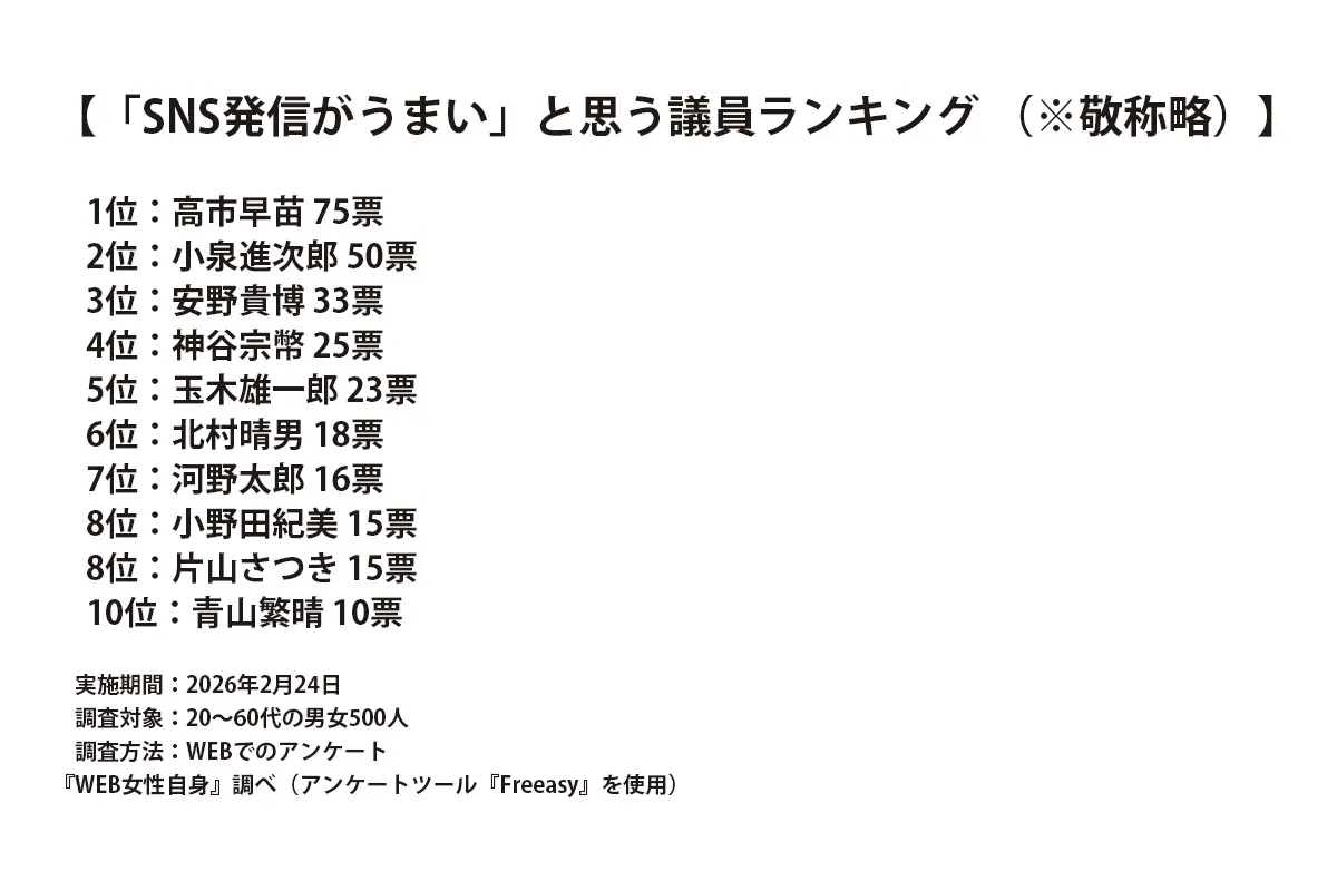女性自身TOP > 国内 > 政治 > 国会議員 > 「SNS発信がうまい」と思う議員ランキング!3位安野貴博氏、2位小泉進次郎氏を抑えた1位は? 「SNS発信がうまい」と思う議員ランキング!3位安野貴博氏、2位小泉進次郎氏を抑えた1位は? 記事投稿日:2026/03/01 11:00 最終更新日:2026/03/01 12:34 『女性自身』編集部 (写真:時事通信) 2月8日に投開票が行われた第51回衆議院選挙は、自民党が単独で議席の3分の2以上を獲得する歴史的勝利で幕を閉じた。選挙戦では各陣営がさまざまな戦略を展開するなか、特に注目を集めたのがSNSの活用だ。たとえば国民民主党の玉木雄一郎衆院議員(56)は、自身のYouTubeチャンネルの切り抜き動画制作を推奨し、ネット上での情報拡散を積極的に後押し。神谷宗幣参院議員(48)率い... 記事の続きを読む 出典元:WEB女性自身 【関連画像】 【関連記事】 【写真あり】「議員としての活動に役立つものを」高市首相 “総額945万円”の大盤振る舞いで関心高まる「3万円高級カタログギフトの中身」 【写真あり】金子恵美の痛烈指摘で75歳政治評論家が大炎上…“高市サゲ”連発に「引退したほうがいい」辛辣声も 【写真あり】「あなたに言う資格はあるんですか?」ネット唖然…立憲・杉尾秀哉議員「与党のヤジはいいんですか?」発言に批判殺到 関連カテゴリー: 国内 関連タグ: SNS国会議員政治 こちらの記事もおすすめ 国内 もっと見る 「SNS発信がうまい」と思う議員ランキング!3位安野貴博氏、2位小泉進次郎氏... 2026/03/01 11:00 国内 《「2人目の妊娠を諦めなければならない」会見から2カ月》福間香奈女流五冠「弁... 2026/03/01 11:00 国内 「今の夫でなければ厳しかった」福間香奈女流五冠「同じ勝負の世界で生きてきた」... 2026/03/01 11:00 国内 《周囲はやっとか…と》メディアアーティストの54歳有名教授が15歳少女にわい... 2026/02/28 14:00 国内 《46歳で高齢出産、娘が脳性麻痺に》セーラーズ・三浦静加社長(72) 大ヒッ... 2026/02/28 11:00 国内 「本当に税金の無駄」ネット冷笑…中道・小川代表 国会で高市首相“カタログギフ... 2026/02/28 06:00 国内 人気タグ 真矢キンタロー。宮舘涼太村上淳いとうあさこ演技力映画業界報告ピアーズ・モーガン熱中症北村一輝雑誌モデル カテゴリー 芸能 エンタメニュースインタビュー 皇室国内海外 海外ニュース韓流ニュース スポーツライフ 美容健康暮らしグルメ 地域コラム占い