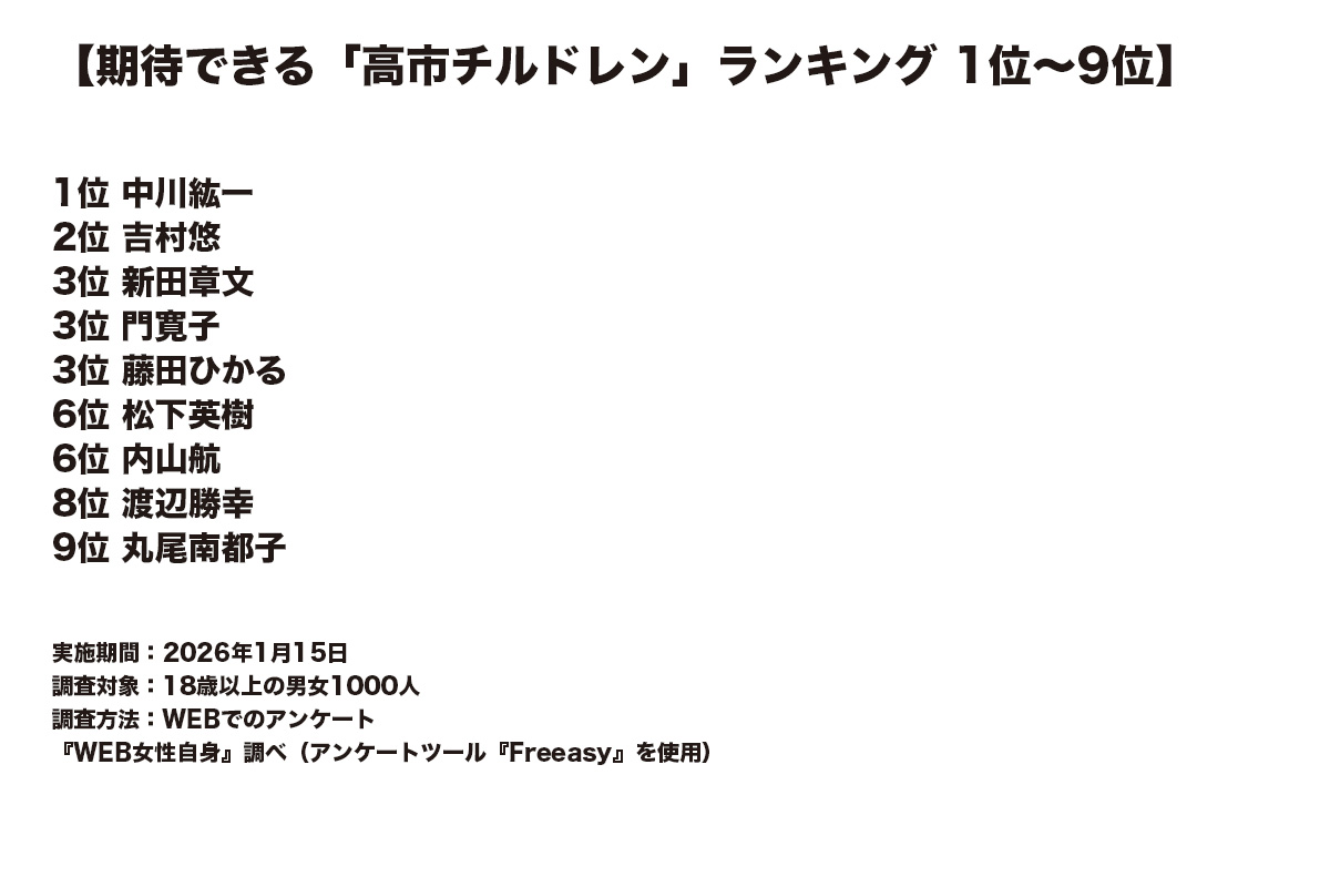 女性自身TOP > 国内 > 政治 > 高市早苗 > 期待できる「高市チルドレン」ランキング!菅元首相の後任、故・中川昭一氏の甥の順位は? 期待できる「高市チルドレン」ランキング!菅元首相の後任、故・中川昭一氏の甥の順位は? 記事投稿日:2026/03/02 11:00 最終更新日:2026/03/02 12:32 『女性自身』編集部 高市早苗首相(写真:時事通信) 2月18日に特別国会が召集され、高市早苗首相(64)の圧倒的人気を追い風に初当選した66人の自民党のルーキー、いわゆる「高市チルドレン」がデビューを果たした。ぜひとも国会にフレッシュな風を吹かせてほしいところだが、2月8日の当選以降、メディアの取材を断るなど、すでに“頼りなさ”が垣間見られる新人もいる。とはいえ、真価が問われるのはこれから。そこで本誌は、アンケートツール... 記事の続きを読む 出典元:WEB女性自身 【関連画像】 【関連記事】 【ランキングあり】期待できる「高市チルドレン」ランキング 1位〜9位 【写真あり】「なんでこんなバカが国のトップなの?」カリスマ的な人気を誇るアーティスト 高市首相の“洋服選び”投稿に怒り爆発 【写真あり】「他所でやれ」セクシー系モデル 新幹線車内での“パンツをチラ見せ”動画が波紋…衆院選でも“半ケツビラ配り”写真が炎上 関連カテゴリー: 国内 関連タグ: アンケートランキング政治高市早苗 こちらの記事もおすすめ 国内 もっと見る 期待できる「高市チルドレン」ランキング!菅元首相の後任、故・中川昭一氏の甥の... 2026/03/02 11:00 国内 「SNS発信がうまい」と思う議員ランキング!3位安野貴博氏、2位小泉進次郎氏... 2026/03/01 11:00 国内 《「2人目の妊娠を諦めなければならない」会見から2カ月》福間香奈女流五冠「弁... 2026/03/01 11:00 国内 「今の夫でなければ厳しかった」福間香奈女流五冠「同じ勝負の世界で生きてきた」... 2026/03/01 11:00 国内 《周囲はやっとか…と》メディアアーティストの54歳有名教授が15歳少女にわい... 2026/02/28 14:00 国内 《46歳で高齢出産、娘が脳性麻痺に》セーラーズ・三浦静加社長(72) 大ヒッ... 2026/02/28 11:00 国内 人気タグ 真矢宮舘涼太キンタロー。2000年代CLUB PRINCE2拠点生活CHAGE and ASKA101回目のプロポーズBreaking DownAIモデルCMソング=LOVE カテゴリー 芸能 エンタメニュースインタビュー 皇室国内海外 海外ニュース韓流ニュース スポーツライフ 美容健康暮らしグルメ 地域コラム占い