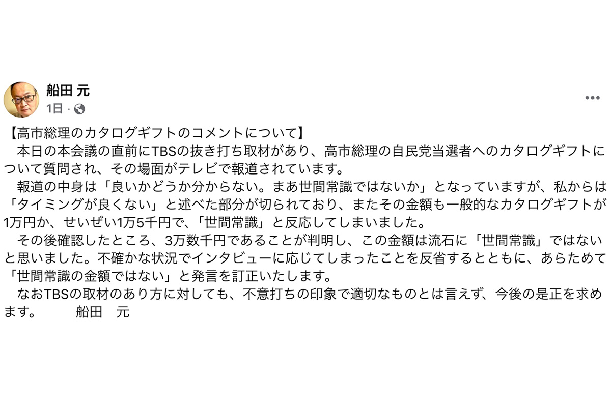 女性自身TOP > 国内 > 政治 > 高市早苗 > 「世間常識ではない」自民ベテラン議員 高市首相“カタログギフト”問題を擁護から一転、非難のブレブレっぷりにツッコミ続出 「世間常識ではない」自民ベテラン議員 高市首相“カタログギフト”問題を擁護から一転、非難のブレブレっぷりにツッコミ続出 記事投稿日:2026/02/27 16:00 最終更新日:2026/02/27 17:33 『女性自身』編集部 高市早苗首相(写真:時事通信) 歴史的大勝利を収めた2月8日投開票の衆院選により、316議席を獲得することとなった自民党。その当選した自民党の全議員に対し、高市早苗首相(64)が「当選祝い」として“高額カタログギフト”を送ったことが24日『文春オンライン』はじめ複数のメディアで報じられ、波紋を呼んでいる。高市氏は24日には自身のXで同問題を認めるコメントを投稿。自身が支部長を務める奈良県第二選挙区支部... 記事の続きを読む 出典元:WEB女性自身 【関連画像】 【関連記事】 【写真あり】「国民感覚とズレてる」小林鷹之氏 SNSでの「やっとお昼ご飯」投稿の“ランチ時間”に違和感続出 【写真あり】4年で700個のゴルフボールを打ち込まれた夫婦が賠償金6億3千万円勝ち取る 【写真あり】金子恵美の痛烈指摘で75歳政治評論家が大炎上…“高市サゲ”連発に「引退したほうがいい」辛辣声も 関連カテゴリー: 国内 関連タグ: ギフト政治船田元高市早苗 こちらの記事もおすすめ 国内 もっと見る 「最前線に行けば血まみれになりますよ!」れいわ・奥田共同代表 代表質問デビュ... 2026/02/27 16:50 国内 「非常に傲慢な態度」高市首相 立憲には国民会議の参加要請なしも“誤認答弁”が... 2026/02/27 16:45 国内 「世間常識ではない」自民ベテラン議員 高市首相“カタログギフト”問題を擁護か... 2026/02/27 16:00 国内 「モニターに怪しい男が…」野田市で80代夫婦が緊縛強盗被害…近隣住民が明かす... 2026/02/27 16:00 国内 「私の後ろにいる女性、誰だかわかりますか」落選の中道大物議員が公開 35年前... 2026/02/27 12:15 国内 「舐めてるな」萩生田光一氏 衆院本会議中の“居眠り疑惑”が波紋…「政治とカネ... 2026/02/27 11:00 国内 人気タグ 真矢キンタロー。宮舘涼太有識者会議SHOGUN葉真中顕入学式MY FIRST STORY藁の楯徳重聡モトーラ世理奈夏目雅子 カテゴリー 芸能 エンタメニュースインタビュー 皇室国内海外 海外ニュース韓流ニュース スポーツライフ 美容健康暮らしグルメ 地域コラム占い