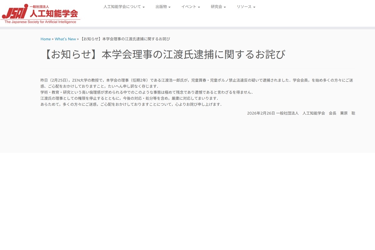 女性自身TOP > 国内 > 事件 > わいせつ > 《周囲はやっとか…と》メディアアーティストの54歳有名教授が15歳少女にわいせつ疑いで逮捕…アート・デザイン業界で囁かれていた「悪い噂」 《周囲はやっとか…と》メディアアーティストの54歳有名教授が15歳少女にわいせつ疑いで逮捕…アート・デザイン業界で囁かれていた「悪い噂」 記事投稿日:2026/02/28 14:00 最終更新日:2026/02/28 15:32 『女性自身』編集部 江渡浩一郎氏(ZEN大学の公式サイトより) メディアアーティストの江渡浩一郎容疑者(54)が2月25日、中学生の少女に現金を渡してわいせつな行為をした児童買春・児童ポルノ禁止法違反の疑いで、京都府警亀岡署に逮捕された。「京都府警によると、逮捕容疑は’25年10月29日、京都市南区のホテル内で当時15歳だった中学生の少女(現在16歳)に現金を手渡したうえで、わいせつな行為に及んだというものです。2人は事件直前にSN... 記事の続きを読む 出典元:WEB女性自身 【関連画像】 【関連記事】 【写真あり】「胸糞悪い」小学館 性加害で罰金刑の漫画作者が名義変えて別作品で連載、謝罪文発表も批判続出…作家陣からも「大きな裏切り」と広がる怒り 【写真あり】電車内で性的暴行を受ける女性を乗客全員が見て見ぬふり 【写真あり】『バチェラー』出演者 ヌード写真をばらまかれていることを告白 関連カテゴリー: 国内 関連タグ: わいせつ事件大学教授逮捕 こちらの記事もおすすめ 国内 もっと見る 《周囲はやっとか…と》メディアアーティストの54歳有名教授が15歳少女にわい... 2026/02/28 14:00 国内 《46歳で高齢出産、娘が脳性麻痺に》セーラーズ・三浦静加社長(72) 大ヒッ... 2026/02/28 11:00 国内 「本当に税金の無駄」ネット冷笑…中道・小川代表 国会で高市首相“カタログギフ... 2026/02/28 06:00 国内 「胸糞悪い」小学館 性加害で罰金刑の漫画作者が名義変えて別作品で連載、謝罪文... 2026/02/27 20:45 国内 「最前線に行けば血まみれになりますよ!」れいわ・奥田共同代表 代表質問デビュ... 2026/02/27 16:50 国内 「非常に傲慢な態度」高市首相 立憲には国民会議の参加要請なしも“誤認答弁”が... 2026/02/27 16:45 国内 人気タグ 真矢宮舘涼太キンタロー。始球式オリンピック寛 一 郎日本料理キャラ変ポカリスエット米津玄師国宝のど自慢 カテゴリー 芸能 エンタメニュースインタビュー 皇室国内海外 海外ニュース韓流ニュース スポーツライフ 美容健康暮らしグルメ 地域コラム占い