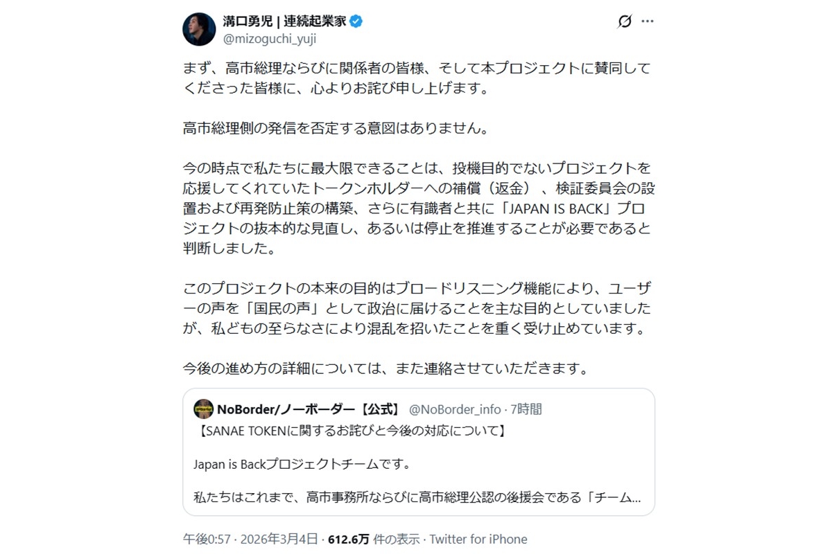 高市首相が関与を全否定したことで、瞬く間に“高市首相の名前を無断で商用利用した”“詐欺行為”と批判が噴出したトークン。そうした事態を受けて、プロジェクトの関係者たちも次々とXで釈明文を発表している。