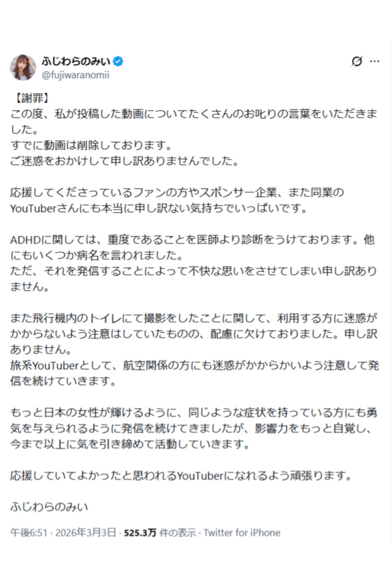 女性自身TOP > 国内 > YouTuber > 《“迷惑行為”と批判続出》旅行系YouTuber フライト中の“トイレ占拠”動画を謝罪…航空会社が示した「見解」 《“迷惑行為”と批判続出》旅行系YouTuber フライト中の“トイレ占拠”動画を謝罪…航空会社が示した「見解」 記事投稿日:2026/03/05 15:30 最終更新日:2026/03/05 15:30 『女性自身』編集部 旅行系YouTuber「ふじわらのみい」のインスタグラムより 《この度、私が投稿した動画についてたくさんのお叱りの言葉をいただきました。すでに動画は削除しております。ご迷惑をおかけして申し訳ありませんでした》(以下、《》内はすべて原文ママ)3月3日、Xでこう謝罪したのは旅行系YouTuber・ふじわらのみい(26、以下みい)。国内のみならず、世界中の危険な場所も果敢に旅をする動画が人気を博し、チャンネル登録者数は26万人を超える。... 記事の続きを読む 出典元:WEB女性自身 【関連画像】 【関連記事】 【写真あり】「非常識」と批判殺到…人気YouTuberが高速道路で“迷惑行為→逆ギレ” 昨年は道路陥没事故の不適切発言で大炎上 【写真あり】「かわいそうすぎる」登録者数30万人の13歳差夫婦YouTuber 夫が“連れ子”に「邪魔」発言が物議 【写真あり】「日本をバカにしてる」フランス人YouTuberが福島被災地の空き家でASMR撮影、コメ欄には怒りの声…役場は「パトロール強化図る」 関連カテゴリー: 国内 関連タグ: Air JapanYouTuber迷惑行為 こちらの記事もおすすめ 国内 もっと見る 《“迷惑行為”と批判続出》旅行系YouTuber フライト中の“トイレ占拠”... 2026/03/05 15:30 国内 “安全装置”のないエレベーターが全国に47万台も…閉じ込め、衝突事故が増加の... 2026/03/05 06:00 国内 「赤字は罪悪である」ニデック・永守氏 解雇を示唆、大勢の前で罵倒…報告書で明... 2026/03/05 06:00 国内 《“出来レース”の指摘も》ラサール石井氏 内紛続きの社民党首選への出馬にネッ... 2026/03/05 06:00 国内 「失礼な物言い」「SANAE TOKEN」運営の溝口氏 関与全否定した高市首... 2026/03/04 19:30 国内 「提案させていただいた」と豪語の京大教授 高市首相が関与否定の「SANAE ... 2026/03/04 17:10 国内 人気タグ 黒柳徹子寺島進田久保眞紀2022年AマッソBOOWYAFTERSCHOOLAKINABoom Trigger8人の女たち9番街レトロ1994年 カテゴリー 芸能 エンタメニュースインタビュー 皇室国内海外 海外ニュース韓流ニュース スポーツライフ 美容健康暮らしグルメ 地域コラム占い