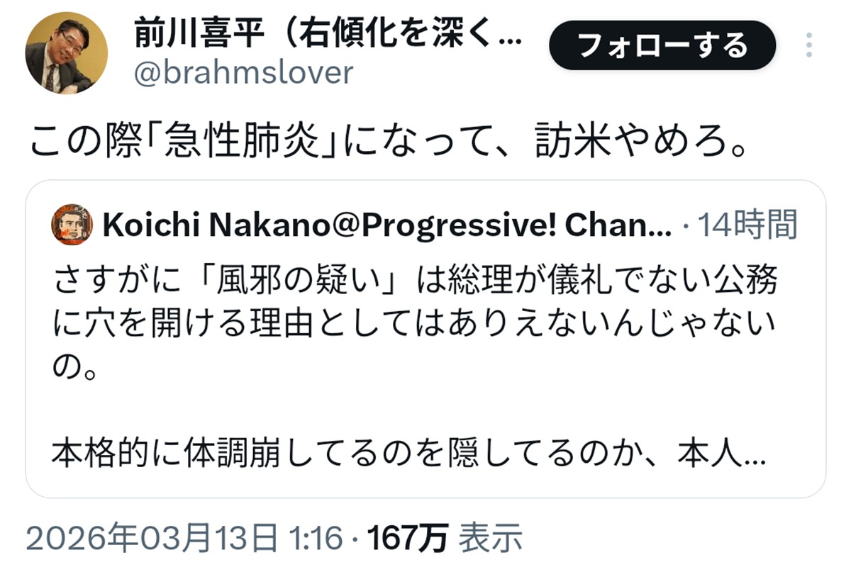 女性自身TOP > 国内 > 政治 > 前川喜平 > 「さすがに人としてどうなの?」前川喜平氏 体調不良の高市首相への“心無い言葉”に批判殺到 「さすがに人としてどうなの?」前川喜平氏 体調不良の高市首相への“心無い言葉”に批判殺到 記事投稿日:2026/03/13 16:00 最終更新日:2026/03/13 16:00 『女性自身』編集部 前川喜平氏 元文部科学事務次官の前川喜平氏(71)が3月13日にXを更新。高市早苗首相(65)に向けた投稿が、ネット上で波紋を広げている。高市氏は12日、衆議院予算委員会での答弁を終えた後、しばらく席から立ち上がれない様子を見せ、周囲の閣僚らが気遣う場面があった。その後、体調不良のため、夜に予定されていた中東諸国の駐日大使らとの会合を急きょ欠席。会合には木原稔官房長官(56)が代理... 記事の続きを読む 出典元:WEB女性自身 【関連画像】 【関連記事】 【写真あり】「若手時代は合コン好き」不倫報道の松本文科相 永田町での「厳しい評判」と「高市首相が切れないワケ」 【写真あり】《トンデモ首長に明暗》“ラブホ密会”小川晶氏が“圧勝”で返り咲き…伊東市長選で惨敗の田久保氏との「決定的な差」 【写真あり】「もう出馬してほしくない」高齢議員ランキング…3位小沢一郎、2位麻生太郎を抑えた1位は? 関連カテゴリー: 国内 関連タグ: 前川喜平批判政治高市早苗 こちらの記事もおすすめ 国内 もっと見る 《担当記者をランク付け》フキハラで処分の元警視庁幹部が「何でも言うことを聞く... 2026/03/13 16:50 国内 「一切関与していない!」堀江貴文氏 サナエトークン騒動で巻き添え炎上に猛反論... 2026/03/13 16:30 国内 「さすがに人としてどうなの?」前川喜平氏 体調不良の高市首相への“心無い言葉... 2026/03/13 16:00 国内 「いつもと違う」ネット騒然…高市首相 “風邪の疑い”で外交キャンセル、直前の... 2026/03/13 15:50 国内 《わいせつ行為で逮捕》NHKチーフD NHK関係者が証言する「日本代表五輪メ... 2026/03/13 14:00 国内 《党勢失速中に痛手》れいわ・山本代表に“政治とカネ”疑惑報道…大石あきこ共同... 2026/03/13 11:00 国内 人気タグ WBC神田沙也加前山剛久Amazon2LDK2018年CNNCreepy NutsCocomi2拠点生活Char2025年 カテゴリー 芸能 エンタメニュースインタビュー 皇室国内海外 海外ニュース韓流ニュース スポーツライフ 美容健康暮らしグルメ 地域コラム占い