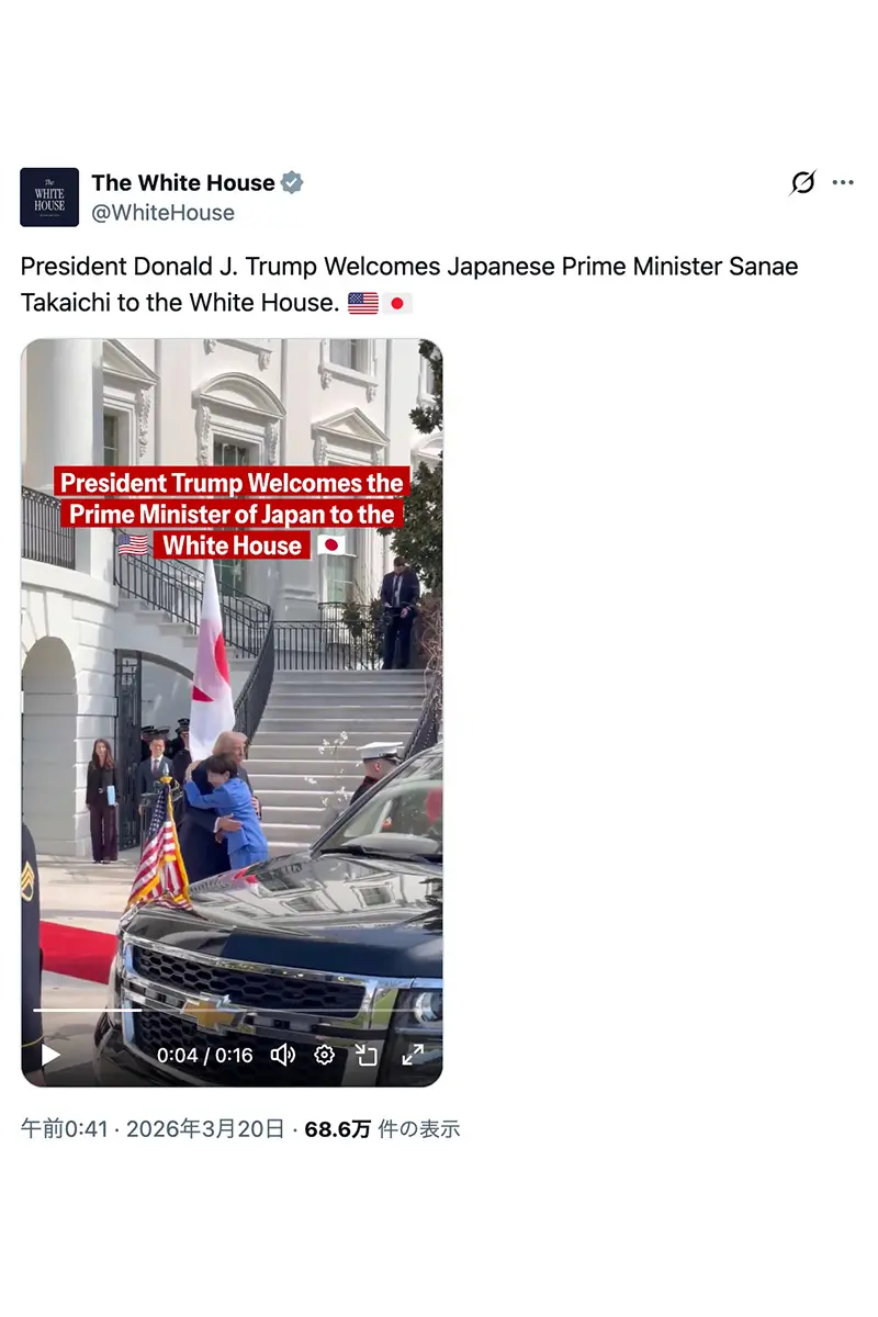 まるで、高市氏が一目散にハグをしに行ったかのようにも映ったワンシーン。この様子を収めた動画はホワイトハウスのX公式アカウントで公開され、視聴したユーザーからはこんな声が(以下、《》内はすべて原文ママ)。