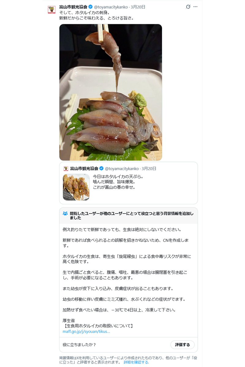 女性自身TOP > 国内 > SNS > 富山県 > 「限りなく誤解を招く」と批判続出…富山市観光協会 Xに投稿した「ホタルイカの刺身」に“生食疑惑”浮上も「適切な下処理が施されたもの」とキッパリ否定 「限りなく誤解を招く」と批判続出…富山市観光協会 Xに投稿した「ホタルイカの刺身」に“生食疑惑”浮上も「適切な下処理が施されたもの」とキッパリ否定 記事投稿日:2026/03/24 11:00 最終更新日:2026/03/24 12:32 『女性自身』編集部 富山市観光協会のX公式アカウントより 春になり、富山湾に押し寄せ、今年も旬を迎えたホタルイカ。富山県農林水産総合技術センター・水産研究所が2月に発表した漁況見通しによれば、今年は例年よりも多く来遊する見込みだという。そんななか、Xではホタルイカの食べ方をめぐって物議を醸していることが——。《今日はホタルイカの天ぷら。噛んだ瞬間、旨味爆発。これが富山の春の幸せ》3月20日、ホタルイカの天ぷらの写真を添え、Xで... 記事の続きを読む 出典元:WEB女性自身 【関連画像】 【関連記事】 【写真あり】“誤解を招く”と物議を醸した「ホタルイカの刺身」 【写真あり】3週間行方不明だった中学生、空き家の煙突内から遺体で発見 【写真あり】「自分の意思で乗ったんでしょ」保守党・百田尚樹代表 辺野古転覆事故・死亡女子高生に浴びせた”自己責任論”に批判続出 関連カテゴリー: 国内 関連タグ: SNS富山県生食観光 こちらの記事もおすすめ 国内 もっと見る 「限りなく誤解を招く」と批判続出…富山市観光協会 Xに投稿した「ホタルイカの... 2026/03/24 11:00 国内 《かつては自宅にびっしりバーキン》宮崎麗果氏 1.5億円脱税認めた初公判後に... 2026/03/24 11:00 国内 「共同代表を辞職してください」れいわ・大石あきこ氏 “身内”からも強烈ダメ出... 2026/03/24 11:00 国内 「すごい映像」高市首相 35年前の「バブル全開」姿にネット衝撃…傍らには茂木... 2026/03/24 06:00 国内 「肝心な部分が見えません」斎藤知事 “主役ボケボケ”の公務写真にネット騒然…... 2026/03/23 18:40 国内 「埋蔵金の話になっても…」徳川慶喜家・第五代当主の主婦(57)が学生時代は「... 2026/03/22 11:00 国内 人気タグ 宮沢りえ野々村真百田尚樹175Ra-nation72時間ホンネテレビ100万円50セント2000年代BS日テレBMI83年組 カテゴリー 芸能 エンタメニュースインタビュー 皇室国内海外 海外ニュース韓流ニュース スポーツライフ 美容健康暮らしグルメ 地域コラム占い