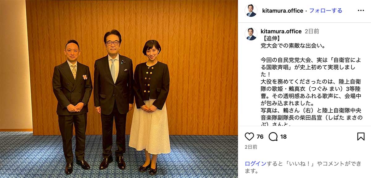 女性自身TOP > 国内 > 政治 > 小泉進次郎 > 「他責思考どうにかならんの?」自民党大会 現役自衛官の“制服着用”出席が物議…小泉大臣&党幹部の「釈明」にSNS呆れ 「他責思考どうにかならんの?」自民党大会 現役自衛官の“制服着用”出席が物議…小泉大臣&党幹部の「釈明」にSNS呆れ 記事投稿日:2026/04/14 19:10 最終更新日:2026/04/14 20:42 『女性自身』編集部 小泉進次郎防衛大臣と鶫真衣氏(写真:時事通信) 4月12日に開催された第93回自民党大会は、ソプラの歌手・鶫(つぐみ)真衣氏(38)による国歌斉唱で開幕。鶫真氏といえば、“自衛隊の歌姫”とも称される現役の陸上自衛官だ。「鶫氏は音大卒業後、’14年に陸上自衛隊初の声楽要員として入隊。’22年から中央音楽隊に配属されています。党大会では、冒頭で“現役自衛官兼ソプラノ歌手”である旨が司会者から紹介され、鶫氏は制服を着用の上... 記事の続きを読む 出典元:WEB女性自身 【関連画像】 【関連記事】 【写真あり】「元気そうになってる」菅元首相 “ピクリとも動かない”深刻状態から一変…党大会で見せた“最新近影”に広がる安堵 【写真あり】次期首相に「なってほしくない党首」ランキング…3位自民・高市氏、2位参政・神谷氏を抑えた第1位は? 【写真あり】「令状をとって家宅捜索をしたのでは」京都・男児行方不明から2週間経って自宅付近に“規制線が張られた”意味…敏腕元刑事が解説する「大規模捜索のワケ」 関連カテゴリー: 国内 関連タグ: 小泉進次郎政治自民党自衛隊 こちらの記事もおすすめ 国内 もっと見る 「怪しい人がいたらすぐ噂になる場所」京都・遺体は行方不明男児と判明…地元住民... 2026/04/14 19:10 国内 京都・男児行方不明事件 近隣住民が取材に口にした“心配”「最近はぜんぜん姿を... 2026/04/14 19:10 国内 「他責思考どうにかならんの?」自民党大会 現役自衛官の“制服着用”出席が物議... 2026/04/14 19:10 国内 「元気そうになってる」菅元首相 “ピクリとも動かない”深刻状態から一変…党大... 2026/04/14 18:40 国内 「目くらましの可能性が強く、事件性が高い」遺体は安達結希くんと判明…発見場所... 2026/04/14 18:00 国内 「大きな確証があったのだと」京都・男児行方不明 敏腕元刑事が指摘する「3日連... 2026/04/13 17:30 国内 人気タグ モナキ山本裕典蒼井そらAmazon Prime Video2021年101回目のプロポーズ2022上半期ベストスクープBlu-ray4Minute1億人の大質問!?笑ってコラえて!=LOVEBMI カテゴリー 芸能 エンタメニュースインタビュー 皇室国内海外 海外ニュース韓流ニュース スポーツライフ 美容健康暮らしグルメ コミックコラム占い