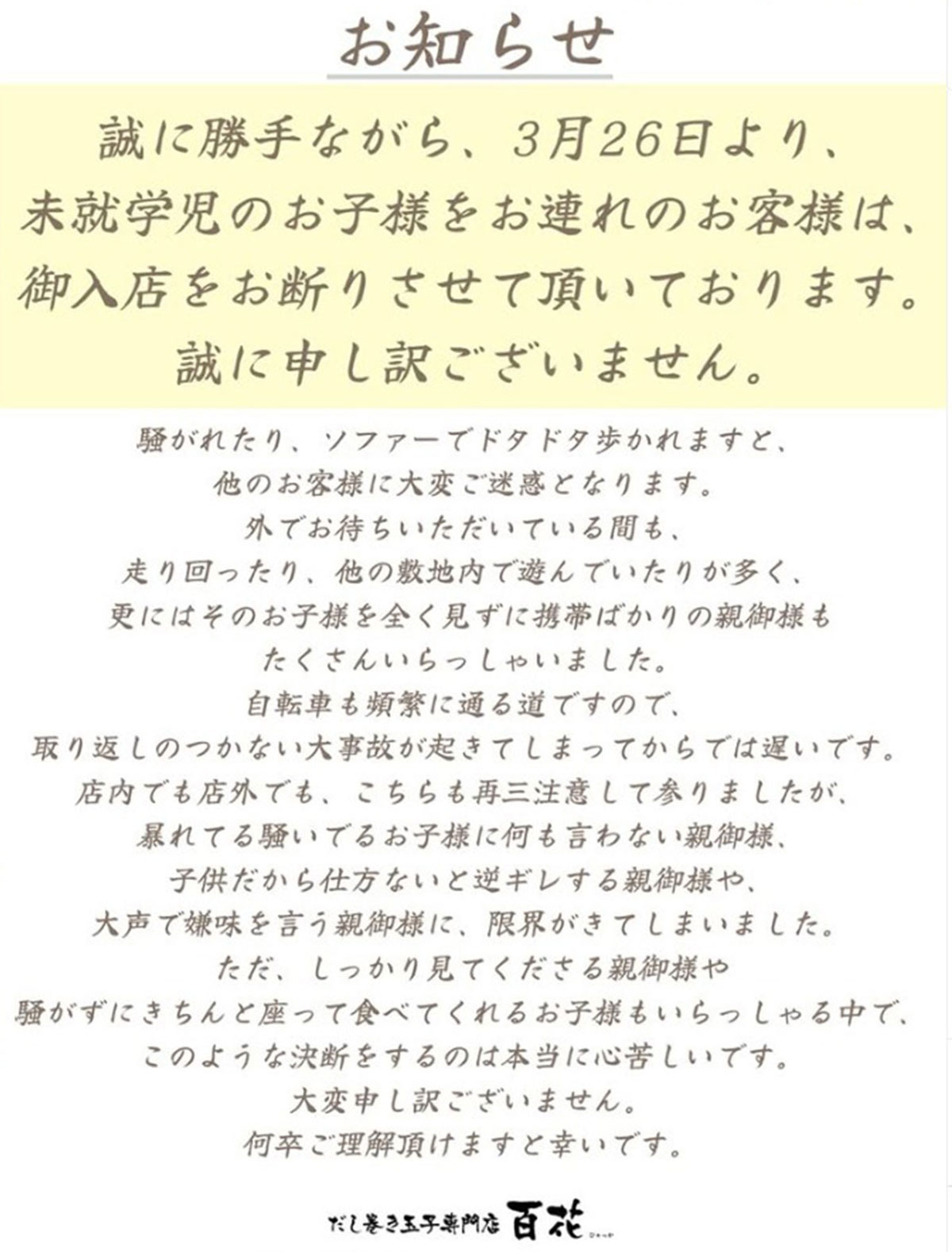 女性自身TOP > 国内 > 社会 > マナー > 「注意すると親に睨みつけられ…」大阪・だし巻き玉子専門店の“子連れ入店お断り”に賛否…店主が明かした迷惑子連れ客”の実態 「注意すると親に睨みつけられ…」大阪・だし巻き玉子専門店の“子連れ入店お断り”に賛否…店主が明かした迷惑子連れ客”の実態 記事投稿日:2026/04/16 18:40 最終更新日:2026/04/16 20:12 『女性自身』編集部 大阪の出し巻き玉子専門店「百花」(写真・同店Instagramより) 大阪市で人気の「だし巻き玉子専門店」の決断が話題を呼んでいる。「未就学児を連れた客の入店を断るという方針を決めた『百花』という店です。3月26日から実施しているそうです」(WEBメディアライター)2024年、カフェから業態をリニューアル。タレをかけたごはんがすべて隠れるほど、巨大なだし巻き玉子を載せた「だし巻き玉子重膳」や「だし巻き玉子サンド」などが評判で、週末には5時... 記事の続きを読む 出典元:WEB女性自身 【関連画像】 【関連記事】 【写真あり】「言い訳の余地もありません」著名元刑事 安達結希くん遺体発見日の生配信での“不適切発言”が炎上…本人が語った「反省の弁」 【写真あり】26年前に誘拐された男性、隣家の羊小屋から生きて発見される 【写真あり】No.1モテ女性芸人 タイトT×斜めがけバッグ姿の“トイレ自撮り”が「可愛すぎる」と反響…一方で公共マナー巡り波紋 関連カテゴリー: 国内 関連タグ: マナー大阪府社会飲食店 こちらの記事もおすすめ 国内 もっと見る 《発生から1年以上》八潮市陥没事故 道路が一部開通も漂う異臭…地元住民が語る... 2026/04/16 19:00 国内 「注意すると親に睨みつけられ…」大阪・だし巻き玉子専門店の“子連れ入店お断り... 2026/04/16 18:40 国内 「他の人物に頼んだのか」安達結希くん義父を逮捕、殺害認める供述も…元刑事が指... 2026/04/16 17:45 国内 「いきなり机を投げて…」逮捕の義父が起こした“ブチギレ事件”の真相 同級生が... 2026/04/16 14:15 国内 「言い訳の余地もありません」著名元刑事 安達結希くん遺体発見日の生配信での“... 2026/04/16 14:00 国内 《がん手術一時2カ月待ちのケースも》医師が足りない都道府県ランキング…3位千... 2026/04/16 11:00 国内 人気タグ 大野智坂口杏里モナキcapsuleCreepy NutsCBX2022年72時間ホンネテレビBoom Triggeraespa2020ベストスクープBUCK-TICK カテゴリー 芸能 エンタメニュースインタビュー 皇室国内海外 海外ニュース韓流ニュース スポーツライフ 美容健康暮らしグルメ コミックコラム占い