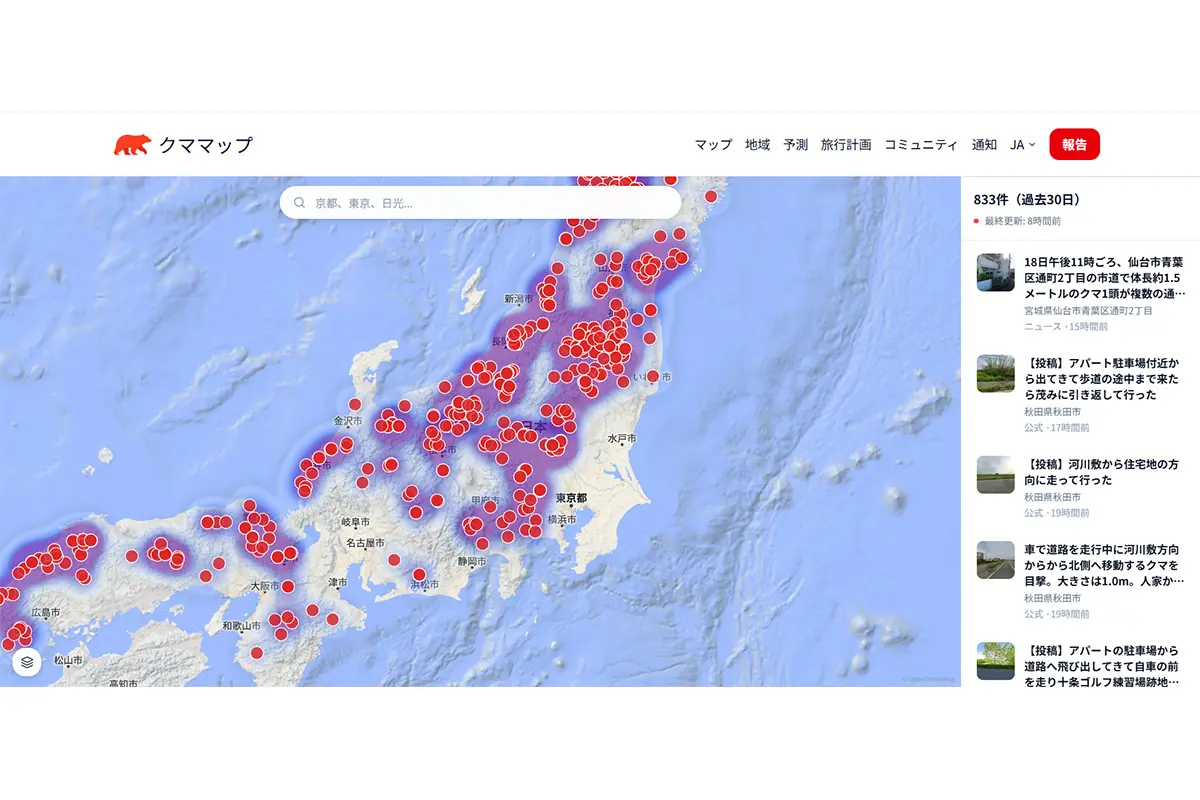 女性自身TOP > 国内 > 生物 > クマ > 《クマの目撃情報が過去1カ月で830件超!》「飢餓状態だからではない」研究チーム科長が明かす“人里出没”の意外なワケ > 《クマの目撃情報が過去1カ月で830件超!》「飢餓状態だからではない」研究チーム科長が明かす“人里出没”の意外なワケの画像・写真2枚目 《クマの目撃情報が過去1カ月で830件超!》「飢餓状態だからではない」研究チーム科長が明かす“人里出没”の意外なワケ 記事投稿日:2026/04/21 12:00 最終更新日:2026/04/21 13:34 2026年4月19日現在、過去30日で833件のクマの目撃情報が寄せられている(全国クマ出没マップ『クママップ』より) この写真の記事へ こちらの写真もおすすめ