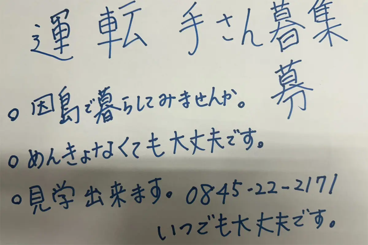 女性自身TOP > 国内 > SNS > 路線バス > 瀬戸内海・因島の路線バス会社が“手書きチラシ”で運転手募集“誤字”もそのまま、担当者が明かす反響の大きさ > 瀬戸内海・因島の路線バス会社が“手書きチラシ”で運転手募集“誤字”もそのまま、担当者が明かす反響の大きさの画像・写真2枚目 瀬戸内海・因島の路線バス会社が“手書きチラシ”で運転手募集“誤字”もそのまま、担当者が明かす反響の大きさ 記事投稿日:2026/04/28 17:30 最終更新日:2026/04/28 19:03 「因の島バス」が公開したバス運転手募集チラシ(画像:4月27日投稿の『因の島バス株式会社IN因島』のX「@innoshimabus」より) この写真の記事へ こちらの写真もおすすめ