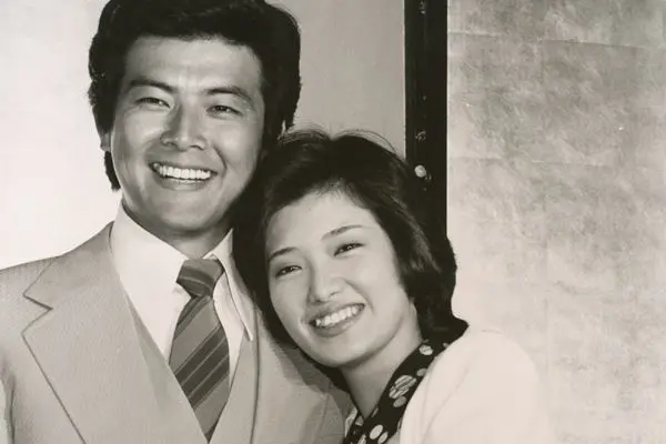 婚約発表で友和の肩に顔を寄せる百恵さん