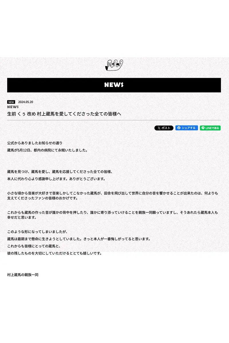 5月20日、4人組人気ロックバンドNEEのメンバー・くぅさんが5月12日に亡くなっていたことが発表された。25歳という若さだった。バンドの公式ホームページでは、「生前 くぅ 改め 村上蔵馬を愛してくださった全ての皆様へ」という掲題で、《小さな頃から音楽が大好きで音楽しかしてこなかった蔵馬が、田舎を飛び出して世界に自分の音を響かせることが出来たのは、何よりも支えてくださったファンの皆様のおかげです》とファンへの感謝を綴った。
