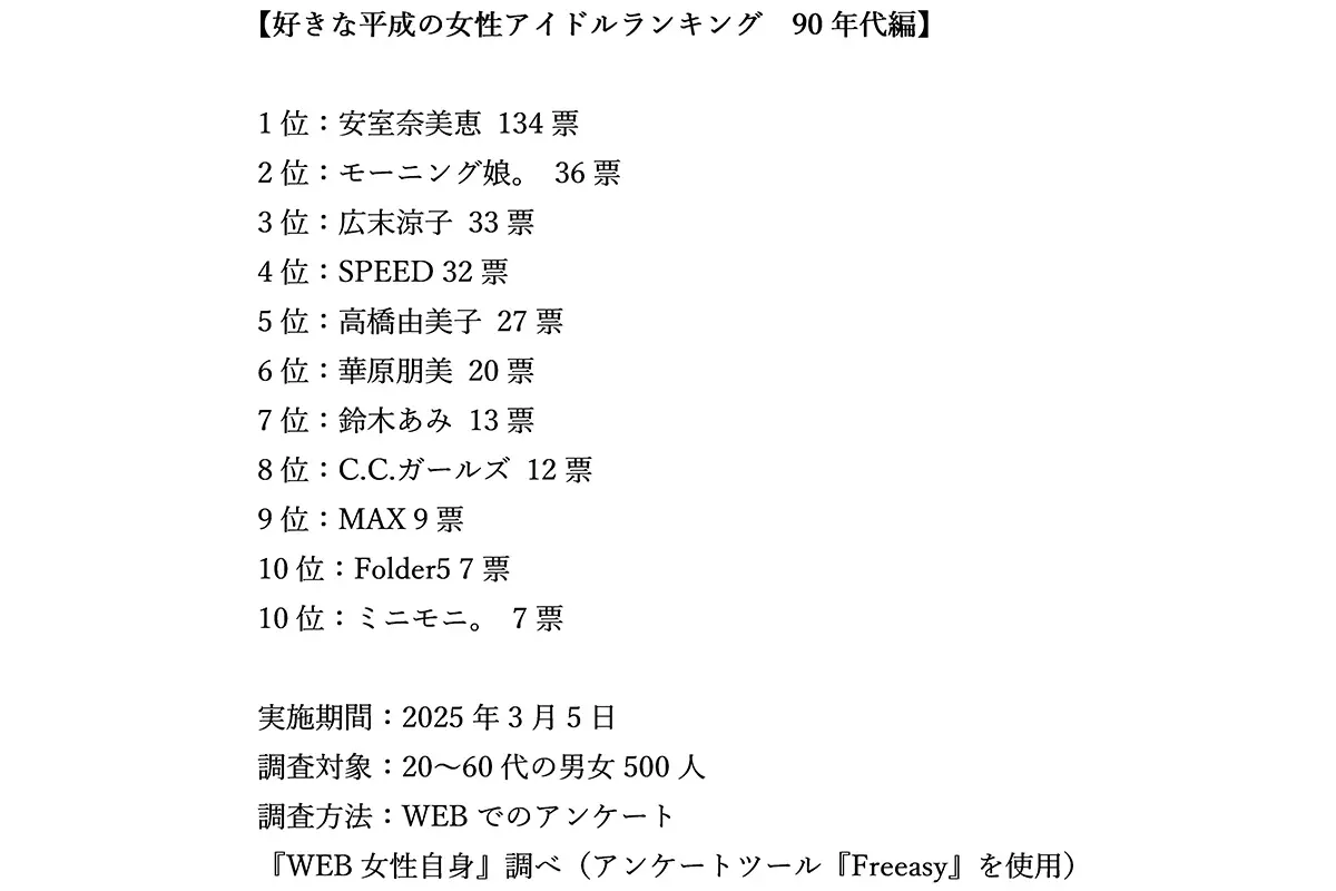 現在も活躍する大所帯の“グループアイドル”文化が花開いた平成時代。ソロでもグループでも、昭和とは一線を画す新時代のアイドルが続々誕生した。そこで本誌は、WEBアンケートツール「Freeasy」にて、20代から60代の男女500人を対象に、「好きな平成の女性アイドル(90年代)」についてアンケート調査を実施した。