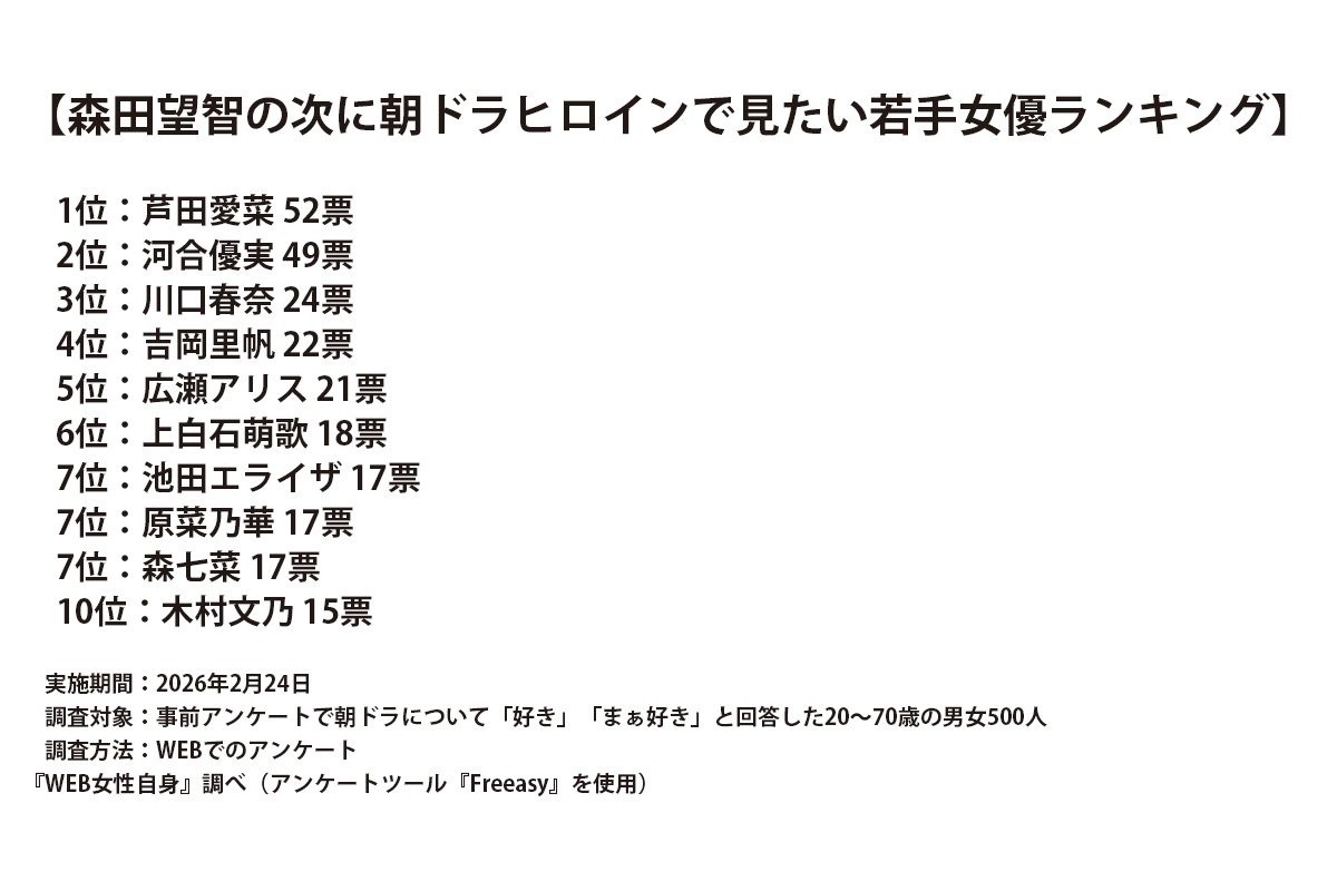女性自身TOP > 芸能 > エンタメニュース > 女優 > ランキング > 森田望智の次に朝ドラヒロインで見たい若手女優ランキング!3位川口春奈、2位河合優実を抑えた1位は? 森田望智の次に朝ドラヒロインで見たい若手女優ランキング!3位川口春奈、2位河合優実を抑えた1位は? 記事投稿日:2026/02/27 11:00 最終更新日:2026/02/27 11:00 『女性自身』編集部 (写真:本誌写真部) 髙石あかり(23)が演じるヒロイン・トキの奮闘も、いよいよクライマックスへと向かっているNHK連続テレビ小説『ばけばけ』。朝ドラのヒロインといえば、作品の顔であると同時に、半年間にわたって視聴者の毎日に寄り添う“朝の顔”でもある。無名に近い存在から一躍ブレイクを果たす例も少なくなく、若手女優にとってはキャリアを大きく左右する重要な舞台だ。2027年前期の『巡るスワン』で... 記事の続きを読む 出典元:WEB女性自身 【関連画像】 【関連記事】 【写真あり】堀北真希 茶髪ショートに…親子3人の休日で見せた激変の今 【写真あり】松田聖子 涙の熱唱、“激ヤセ姿”での打ち合わせも目撃…沙也加さん亡き後も続ける「気丈生活」 【写真あり】上戸彩 旅行は普通車、服装も地味…売れっ子でも庶民派貫く 関連カテゴリー: 芸能 エンタメニュース 関連タグ: NHKランキング女優朝ドラ こちらの記事もおすすめ 芸能 もっと見る 森田望智の次に朝ドラヒロインで見たい若手女優ランキング!3位川口春奈、2位河... 2026/02/27 11:00 エンタメニュース キンタロー。大炎上も…45歳“新喜劇”芸人の“りくりゅう”ものまねが叩かれな... 2026/02/26 11:00 エンタメニュース Snow Man宮舘涼太 熱愛報道でコメント欄が阿鼻叫喚のなか“お相手”女子... 2026/02/26 11:00 エンタメニュース 「今では意味が重く響いている」GACKT 明かした“25年来の盟友”亡き真矢... 2026/02/25 19:45 インタビュー 《長年の悩みが時代劇にも影響》上白石萌音 ‘27年大河ドラマ出演前に踏み切っ... 2026/02/25 19:15 エンタメニュース 地下アイドル15組出演の“ガラガラ”武道館フェスに賛否…クロちゃんは「夢の舞... 2026/02/25 17:55 エンタメニュース 人気タグ 真矢宮舘涼太キンタロー。藤本美貴U-NEXTドリュー・バリモアミッション会社統合消息不明Airbnbイルカすいか カテゴリー 芸能 エンタメニュースインタビュー 皇室国内海外 海外ニュース韓流ニュース スポーツライフ 美容健康暮らしグルメ 地域コラム占い
