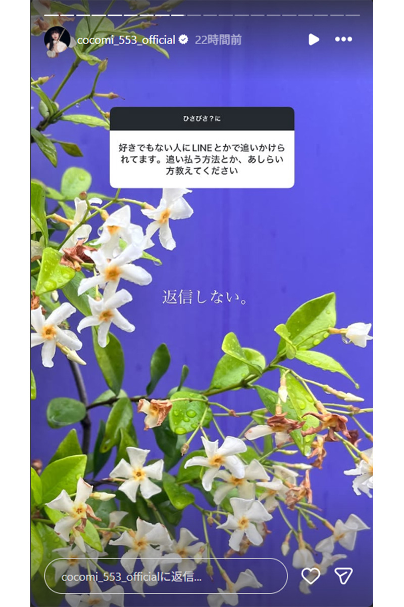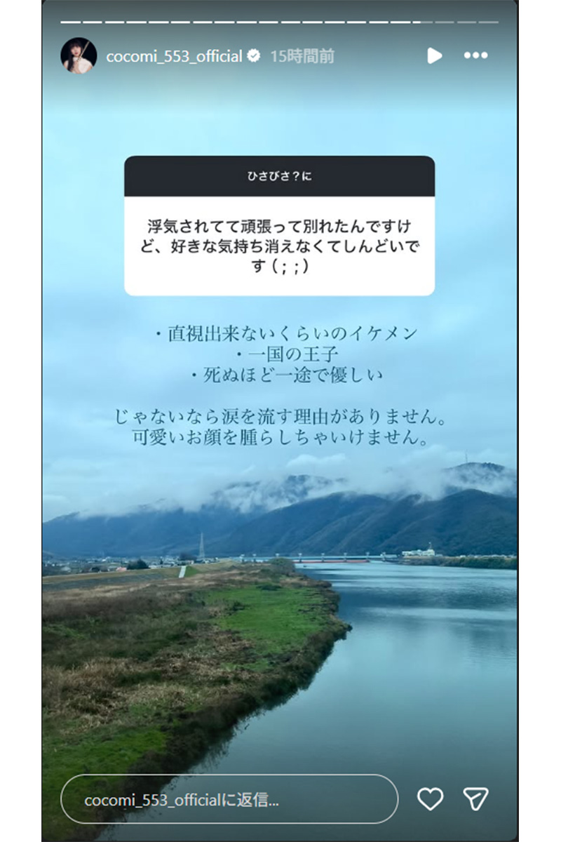 女性自身TOP > 芸能 > エンタメニュース > アーティスト > Cocomi > 「旦那が14下の女の子と社内不倫してたら」Cocomi 顔を引きつらせ…ファンの恋愛悩み相談に回答した「2文字スラングの意味」 「旦那が14下の女の子と社内不倫してたら」Cocomi 顔を引きつらせ…ファンの恋愛悩み相談に回答した「2文字スラングの意味」 記事投稿日:2026/03/02 18:45 最終更新日:2026/03/02 20:17 『女性自身』編集部 Cocomiのインスタグラムより 木村拓哉(53)と工藤静香(55)の長女でフルート奏者・モデルのCocomi(24)が、3月1日までにインスタグラムのストーリーズを更新。《ひさびさ?に》のコメントを添えて、ファンから質問を募った。とりわけ注目を集めたのは、恋愛相談に対する“切れ味鋭い”回答だ(以下、《》内はすべて原文ママ)。ストーリーズでは母・静香が動画に登場する投稿もあり、静香は《落ち込んだらどうや... 記事の続きを読む 出典元:WEB女性自身 【関連画像】 【関連記事】 【写真あり】「変顔なのに綺麗すぎる」ファンを唸らせたCocomiの“神回答” 【写真あり】工藤静香 49歳のビキニ公開で普遍の体型と人間性に絶賛の声 【写真あり】「髪型ショート!?」工藤静香 木村拓哉風チェックシャツ&穴あきデニムのイメチェン姿にファン歓喜 関連カテゴリー: 芸能 エンタメニュース 関連タグ: Cocomiアーティスト恋愛相談 こちらの記事もおすすめ 芸能 もっと見る 「旦那が14下の女の子と社内不倫してたら」Cocomi 顔を引きつらせ…ファ... 2026/03/02 18:45 エンタメニュース 「アウトじゃないですか?」人気YouTuberいけちゃん タイでの“笑気ガス... 2026/03/02 18:35 エンタメニュース 「恐怖を感じてしまった」24歳グラドル 撮影会での注意喚起に“無理な要求”と... 2026/03/02 18:20 エンタメニュース 「なんでそんなに攻めたファション?」宮沢りえ ネット賛否となった“色気ありす... 2026/03/02 17:52 エンタメニュース 《仕事ペースダウンのなか》深田恭子 映画の続編に出演へ!共演実現する「女王様... 2026/03/02 16:00 エンタメニュース 「ちゃんと傷つきます」山本舞香 マイファス活動休止後に見せた“異変”にファン... 2026/03/02 15:05 エンタメニュース 人気タグ 真矢宮舘涼太キンタロー。Acid Black Cherry2021ベストスクープ5類感染症2023年2022上半期ベストスクープD.O.30歳まで童貞だと魔法使いになれるらしいBPOBリーグ カテゴリー 芸能 エンタメニュースインタビュー 皇室国内海外 海外ニュース韓流ニュース スポーツライフ 美容健康暮らしグルメ 地域コラム占い