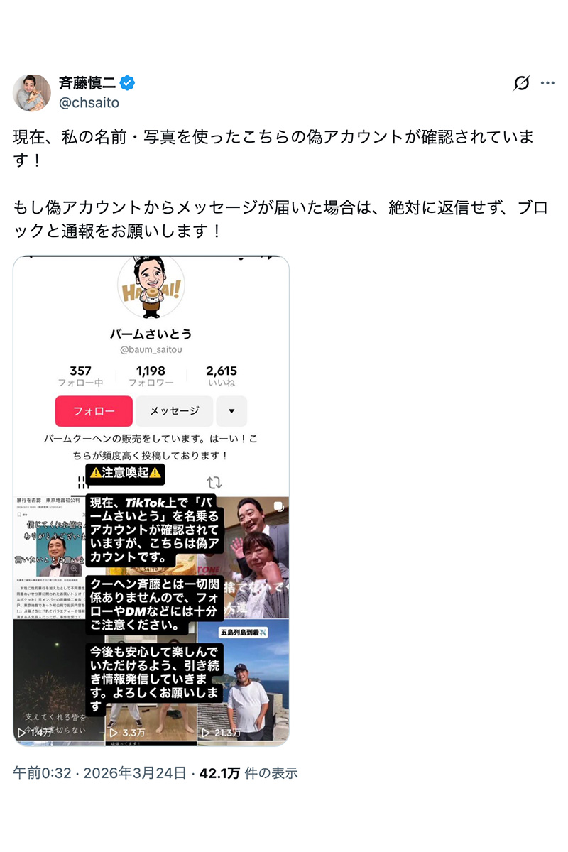 女性自身TOP > 芸能 > エンタメニュース > お笑い芸人 > 斉藤慎二 > 「底辺に俺がいますよ!」元ジャンポケ・斉藤慎二被告 公判中もバームクーヘン販売で気丈にファンサ奔走…被害女性は2500万円示談拒否で「険しい現実」 「底辺に俺がいますよ!」元ジャンポケ・斉藤慎二被告 公判中もバームクーヘン販売で気丈にファンサ奔走…被害女性は2500万円示談拒否で「険しい現実」 記事投稿日:2026/03/26 19:15 最終更新日:2026/03/26 20:48 『女性自身』編集部 斉藤慎二(写真:本誌写真部) 「3月1日に初公判、17日に2回目の公判が行われました。判決が確定するまでは働くことも自由ですが、写真撮影にも応じるバームクーヘンの移動販売はタレント活動に等しい。それでも積極的に売りに出ているのは、よほど経済的に困窮しているのかもしれません」(芸能関係者)3月24日から26日にかけて、お笑いトリオ・元ジャングルポケットの斉藤慎二被告(43)の姿は埼玉県東松山市にあった... 記事の続きを読む 出典元:WEB女性自身 【関連画像】 【関連記事】 【写真あり】ビキニで登山する有名クライマー、山で凍死 【写真あり】小6と性的関係、服役後に結婚した小学校教師が死去 【写真あり】「一生テレビで見たくない不祥事タレント」3位田代まさし氏、2位中居正広氏を抑えた1位は?【2025年最新版】 関連カテゴリー: 芸能 エンタメニュース 関連タグ: お笑い芸人斉藤慎二裁判 こちらの記事もおすすめ 芸能 もっと見る 「底辺に俺がいますよ!」元ジャンポケ・斉藤慎二被告 公判中もバームクーヘン販... 2026/03/26 19:15 エンタメニュース 「おばあちゃまに似てる」還暦イケメン俳優の16歳次男の近影が衝撃!190cm... 2026/03/26 18:50 エンタメニュース 「人生濃すぎる」万引き逮捕の坂口杏里 パパ活、ファンに金の無心、セクシー女優... 2026/03/26 17:00 エンタメニュース 《本日誕生日》丸山桂里奈 7℃の極寒&小雨が降るなか…仕事と育児の合間に大切... 2026/03/26 16:00 エンタメニュース 「亡くなった人をネタにするなんて…」前山剛久 神田沙也加さんへの“開き直り動... 2026/03/26 14:00 エンタメニュース 「だらしない」と批判も…宮沢りえ 肩ひもずり落ち、タトゥー露出の“大胆ファッ... 2026/03/26 11:00 エンタメニュース 人気タグ 坂口杏里宮沢りえ羽賀研二BOOWYACEesATMBoseA型肝炎BiS2027年問題2019ベストスクープ[Alexandros] カテゴリー 芸能 エンタメニュースインタビュー 皇室国内海外 海外ニュース韓流ニュース スポーツライフ 美容健康暮らしグルメ 地域コラム占い