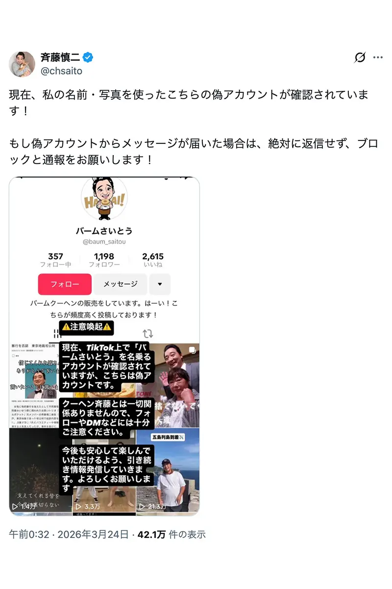 女性自身TOP > 芸能 > エンタメニュース > お笑い芸人 > 斉藤慎二 > 「底辺に俺がいますよ!」元ジャンポケ・斉藤慎二被告 公判中もバームクーヘン販売で気丈にファンサ奔走…被害女性は2500万円示談拒否で「険しい現実」 > 「底辺に俺がいますよ!」元ジャンポケ・斉藤慎二被告 公判中もバームクーヘン販売で気丈にファンサ奔走…被害女性は2500万円示談拒否で「険しい現実」の画像・写真7枚目 「底辺に俺がいますよ!」元ジャンポケ・斉藤慎二被告 公判中もバームクーヘン販売で気丈にファンサ奔走…被害女性は2500万円示談拒否で「険しい現実」 記事投稿日:2026/03/26 19:15 最終更新日:2026/03/26 20:48 厳戒態勢のなか、マンションの裏口から外出する妻・瀬戸サオリ この写真の記事へ こちらの写真もおすすめ