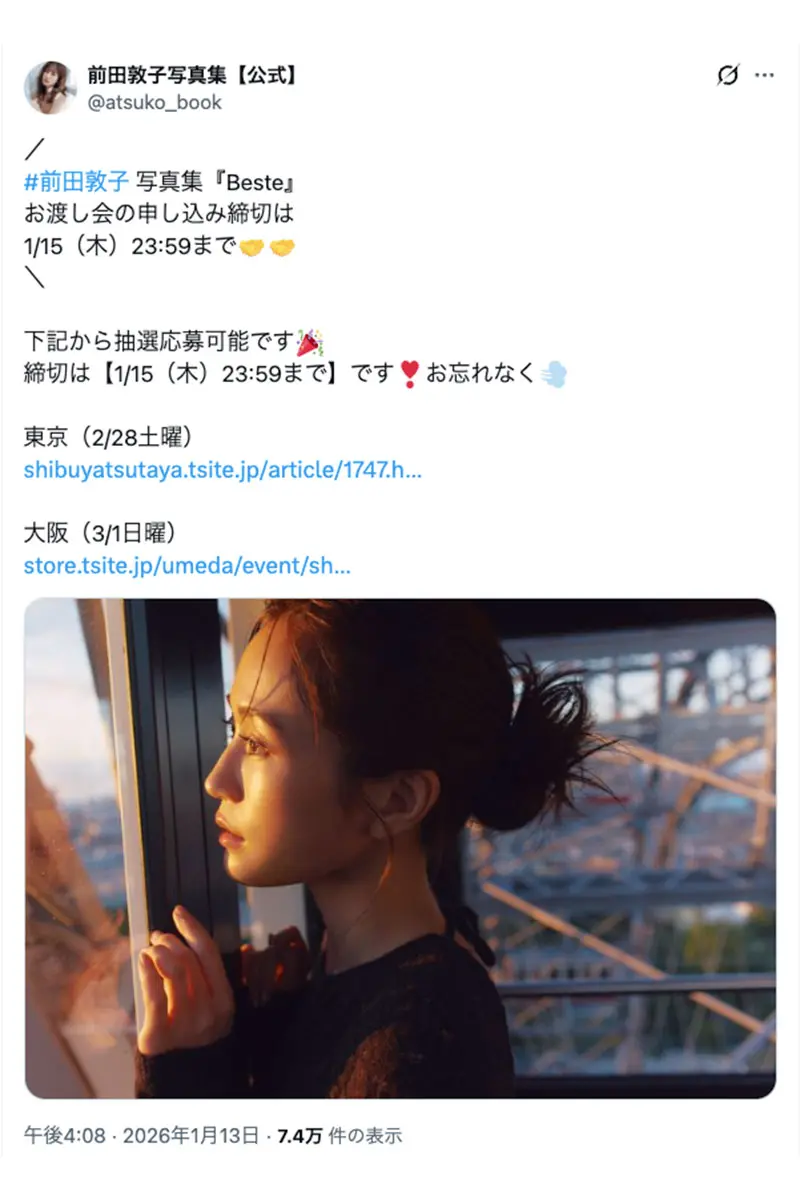 女性自身TOP > 芸能 > エンタメニュース > 女優 > 前田敦子 > 「中途半端なことはしない」前田敦子 ラスト写真集をめぐる“人工物”疑惑を公式が完全否定 「中途半端なことはしない」前田敦子 ラスト写真集をめぐる“人工物”疑惑を公式が完全否定 記事投稿日:2026/04/01 19:05 最終更新日:2026/04/01 19:42 『女性自身』編集部 前田敦子(写真:本誌写真部) 前田敦子(34)が2月13日に発売した14年ぶりの最新写真集『Beste(ベステ)』が、電子版を含めて累計6万部を突破したと発表された。4月1日、版元の講談社が発表したリリースでは、売り上げとあわせて、ネット上で取り沙汰されている“ある疑惑”についても言及している。同写真集は、昨年芸能活動20周年を迎えた前田が、「これが最後」と語るメモリアル作品。撮影は「大人の恋」をテ... 記事の続きを読む 出典元:WEB女性自身 【関連画像】 【関連記事】 【写真あり】前田敦子 離婚から3カ月で新恋人&押しかけ半同棲【2021年ベストスクープ】 【写真あり】篠田麻里子に別居報道、前田敦子は離婚後に新恋人とデート!AKB元祖神7の現在地 【写真あり】前田敦子の離婚報道に「すると思っていた」との声が多い理由 関連カテゴリー: 芸能 エンタメニュース 関連タグ: 写真集前田敦子女優疑惑 こちらの記事もおすすめ 芸能 もっと見る 王林 4年ぶりに地元事務所へ“電撃復帰”で「青森県知事への野望」加速か…関係... 2026/04/01 19:30 エンタメニュース 「中途半端なことはしない」前田敦子 ラスト写真集をめぐる“人工物”疑惑を公式... 2026/04/01 19:05 エンタメニュース 《柏原崇と極秘再婚》内田有紀 “マネージャー”として現場入りする姿をキャッチ... 2026/04/01 19:00 エンタメニュース 辻希美 長男の受験秘話を涙で報告「もらい泣きしました」と反響…一方で赤裸々な... 2026/04/01 18:00 エンタメニュース 《独自》内田有紀 出会いから30年、柏原崇と極秘再婚していた! 2026/04/01 18:00 エンタメニュース 「本当に昔からやりたかった」坂口杏里 万引き逮捕で釈放後に「介護・保育」に意... 2026/04/01 16:40 エンタメニュース 人気タグ 長谷川京子中居正広坂口杏里CD-BOX2018年AdoBIGBANG2022下半期ベストスクープD☆DATE=LOVEBoACEO カテゴリー 芸能 エンタメニュースインタビュー 皇室国内海外 海外ニュース韓流ニュース スポーツライフ 美容健康暮らしグルメ 地域コラム占い