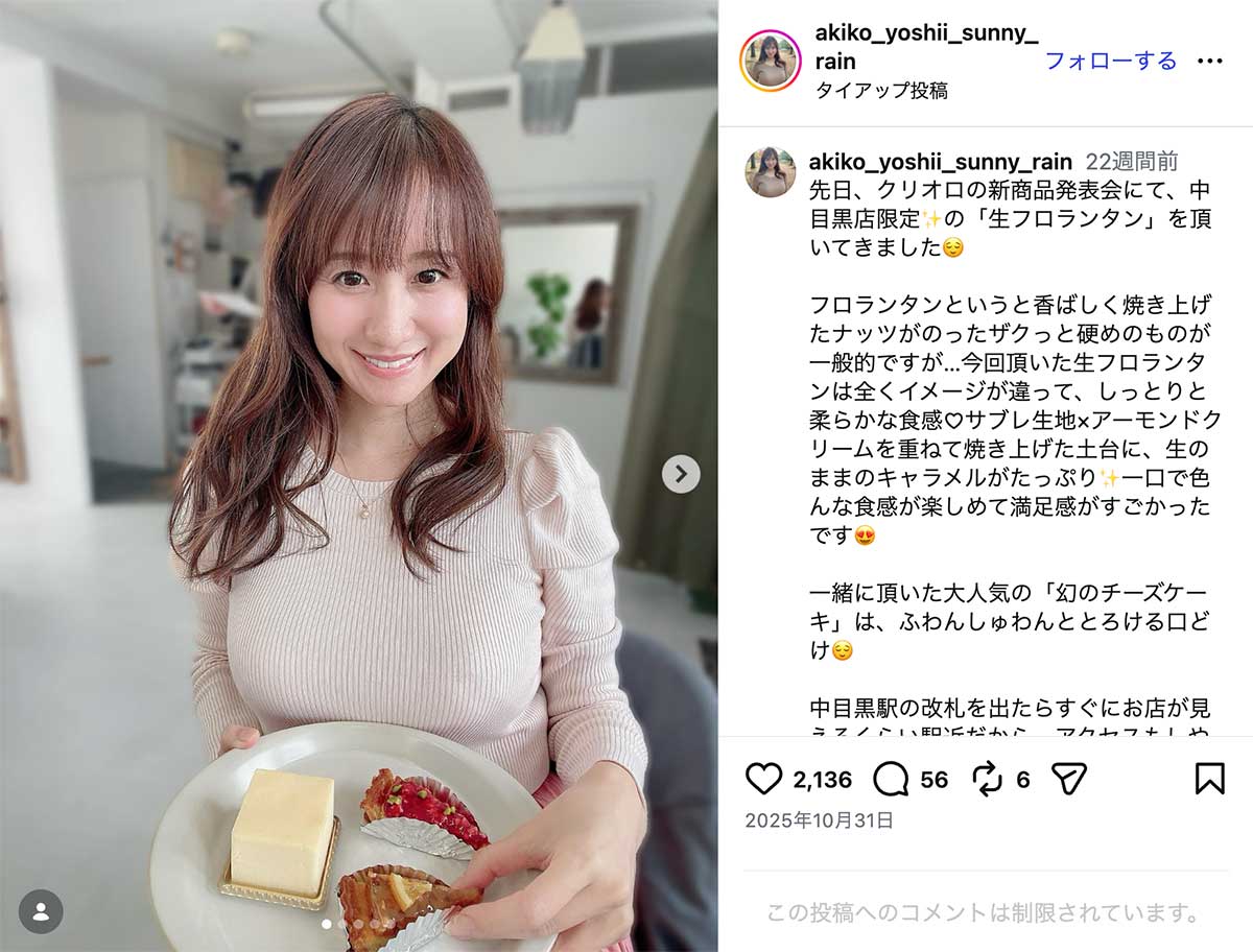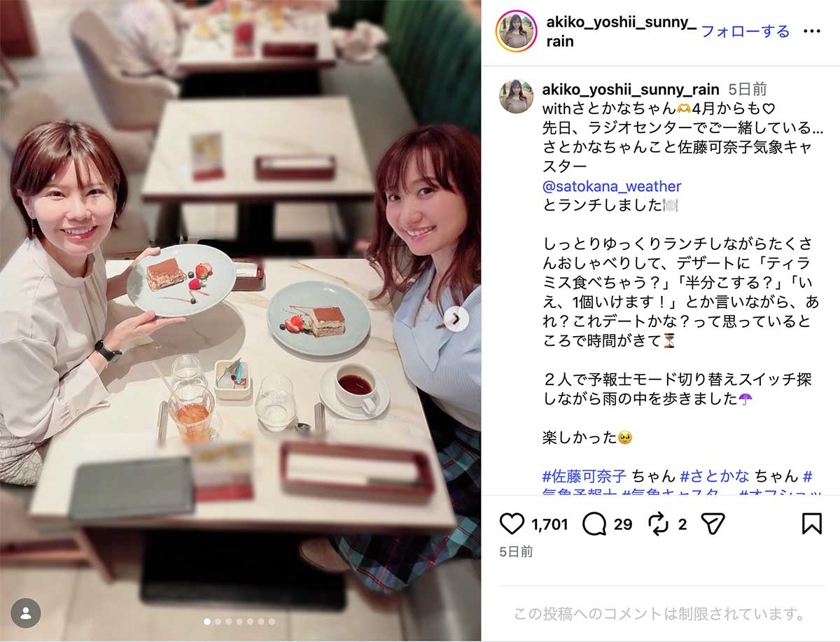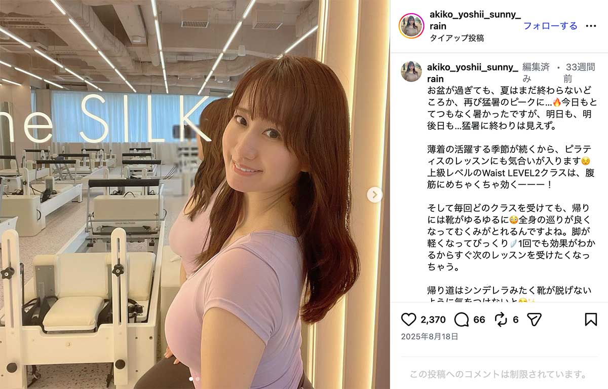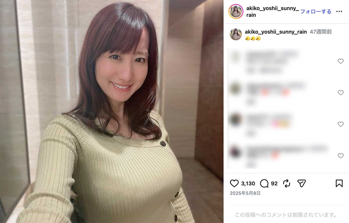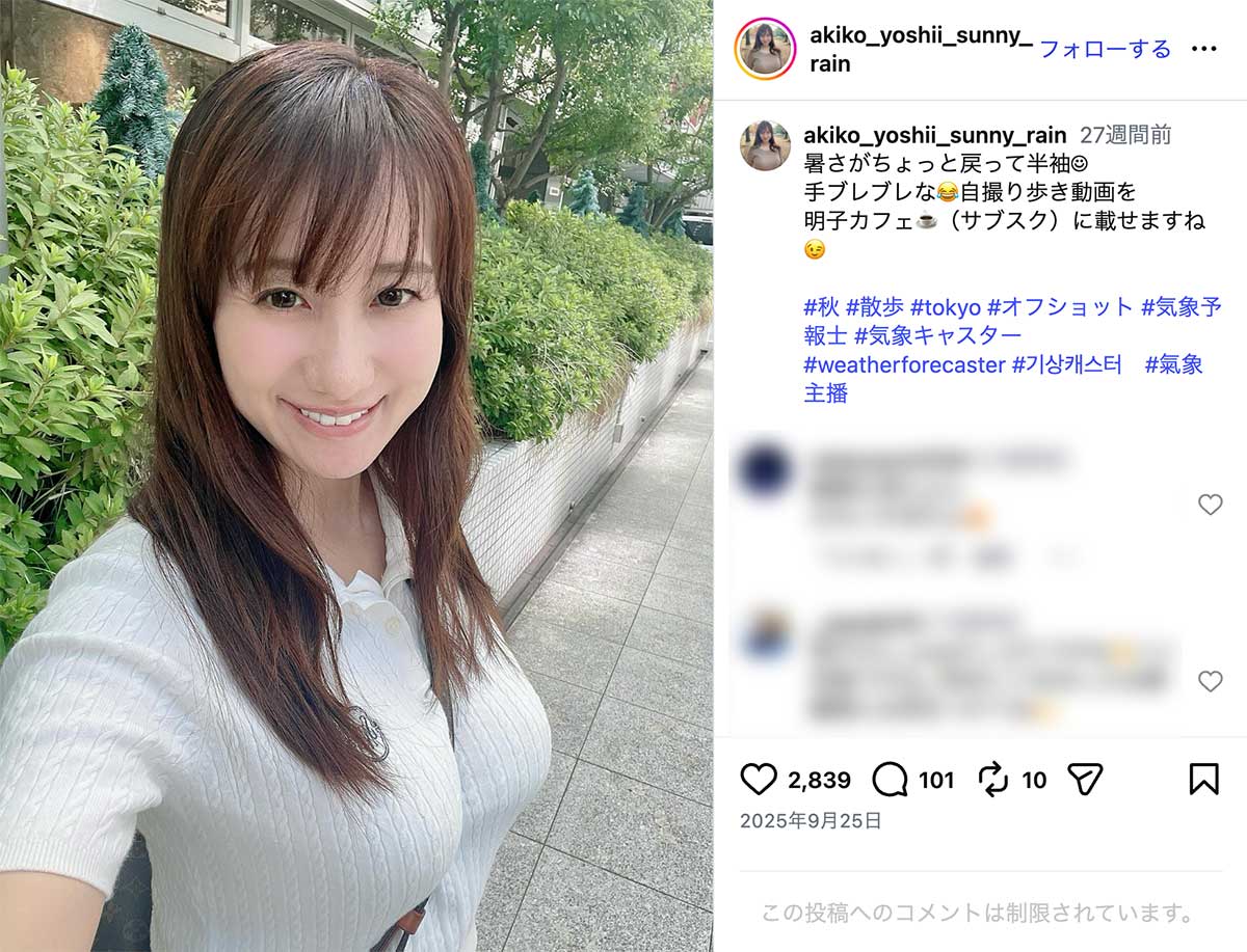 女性自身TOP > 芸能 > エンタメニュース > テレビ > NHK > 「のってますやん」45歳NHK出演の“グラマラス”気象予報士 ボディライン際立つ“ピタピタ”ニット姿が沸騰 「のってますやん」45歳NHK出演の“グラマラス”気象予報士 ボディライン際立つ“ピタピタ”ニット姿が沸騰 記事投稿日:2026/04/08 18:20 最終更新日:2026/04/08 19:52 『女性自身』編集部 吉井明子のインスタグラムより NHKラジオ『マイあさ!』や『Nラジ』などにレギュラー出演し、“美人すぎる気象予報士”として知られる吉井明子(45)。落ち着いた語り口に定評がある一方、SNSで披露するグラマラスなスタイルにも注目が集まっている。4月2日、吉井はInstagramで、胸下で色が切り替わった桜色のニットワンピース姿を披露。ボディラインが際立つ一枚で、バストの存在感が強調されたショットとなっ... 記事の続きを読む 出典元:WEB女性自身 【関連画像】 【関連記事】 【写真あり】《フリー転身から半年》元NHK中川安奈アナ バラエティでは“刺激的”キャラ定着…SNSも“サービスショット”で加速する「セクシー路線」 【写真あり】《際どいコスプレにネット困惑》44歳元NHKアナ 写真集バカ売れで「完全に舵を切った」関係者が語る今後の“路線” 【写真あり】《元NHK女性アナに明暗》中川安奈アナ失速のウラで…43歳アナ 写真集を大ヒットさせた“大胆さ” 関連カテゴリー: 芸能 エンタメニュース 関連タグ: NHKスタイルテレビ気象予報士 こちらの記事もおすすめ 芸能 もっと見る 「のってますやん」45歳NHK出演の“グラマラス”気象予報士 ボディライン際... 2026/04/08 18:20 エンタメニュース 「あまりにもタイミング良すぎ」広瀬アリス 赤西仁との破局報道が“不可解”と関... 2026/04/08 18:00 エンタメニュース 「俺、女子アナと付き合ってたから」と豪語…青井実アナ 険しい『イット!』卒業... 2026/04/08 17:00 エンタメニュース 「この醜悪さに気付いてはどうか」石丸伸二氏 恋愛バラエティ出演も“笑い者”に... 2026/04/08 11:00 エンタメニュース 《有吉、有働由美子も見学》嵐 ラストツアーに駆けつけた「松本潤を叱責した大女... 2026/04/08 11:00 エンタメニュース 「全然忘れられない」人気YouTuberゼパさん 26歳の急逝に広がる衝撃…... 2026/04/08 11:00 エンタメニュース 人気タグ モナキ木村拓哉内田有紀Apple2021年20世紀8番出口AKB総選挙70年談話3262025年2022上半期ベストスクープ カテゴリー 芸能 エンタメニュースインタビュー 皇室国内海外 海外ニュース韓流ニュース スポーツライフ 美容健康暮らしグルメ 地域コラム占い