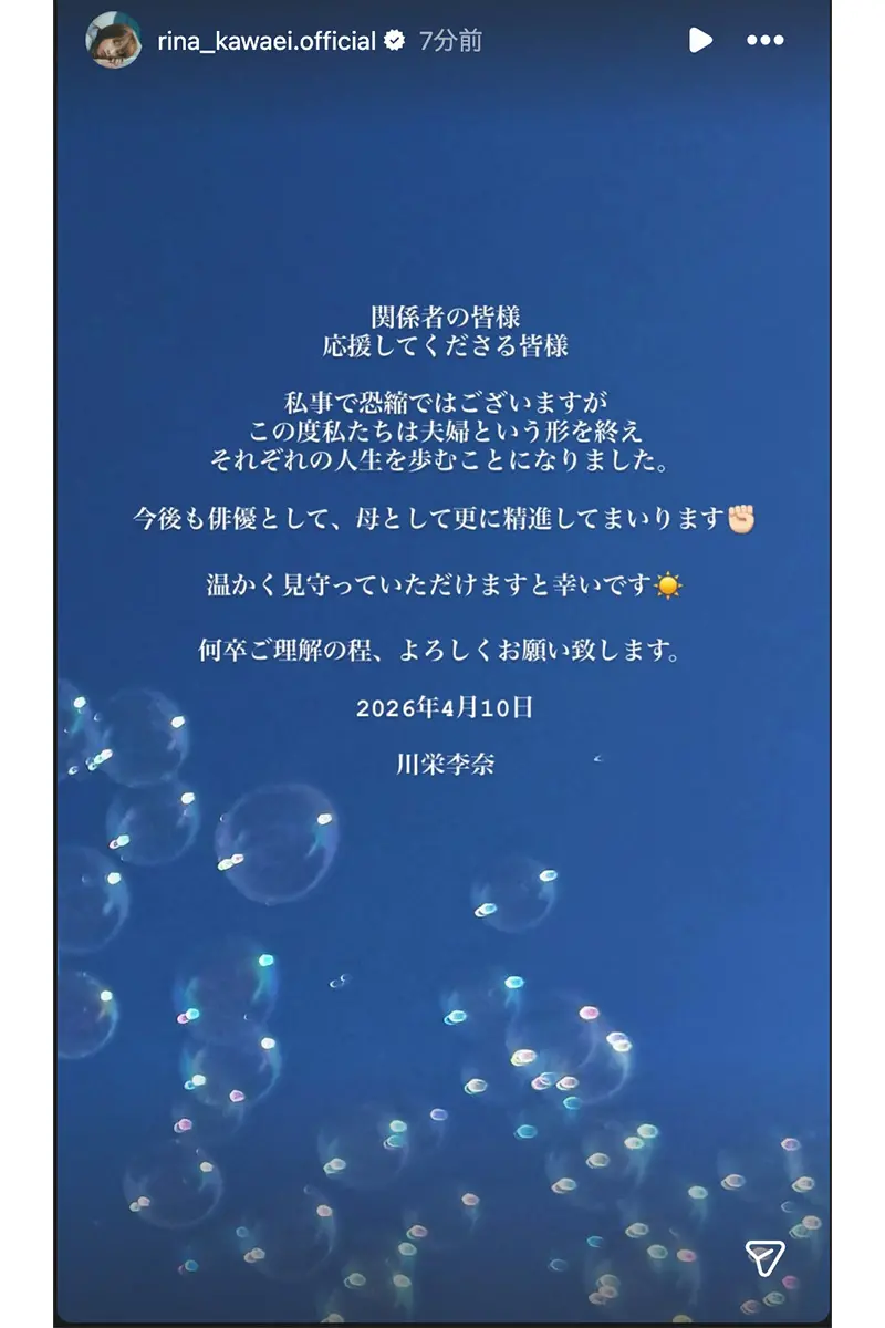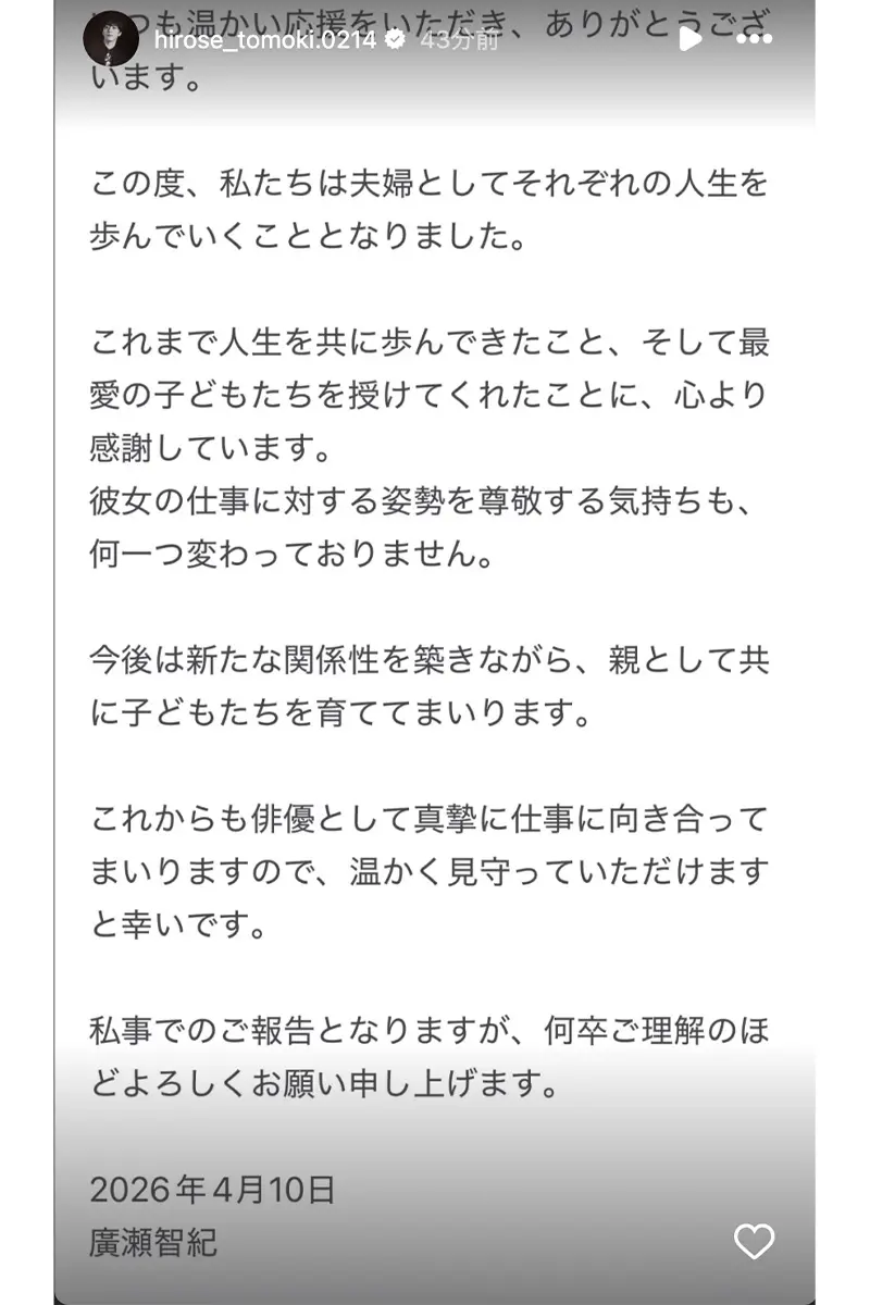 女性自身TOP > 芸能 > エンタメニュース > 女優 > 川栄李奈 > 《「よく7年続いたな」の声も》川栄李奈 離婚コメントに見えた2.5次元俳優との温度差…結婚当初には元夫に“二股報道”で「意味深投稿」も 《「よく7年続いたな」の声も》川栄李奈 離婚コメントに見えた2.5次元俳優との温度差…結婚当初には元夫に“二股報道”で「意味深投稿」も 記事投稿日:2026/04/10 15:05 最終更新日:2026/04/10 16:37 『女性自身』編集部 川栄李奈(写真:本誌写真部) 4月10日深夜、衝撃のニュースが走った。日刊スポーツとスポニチアネックスで、AKB48の元メンバー・川栄李奈(31)と俳優・廣瀬智紀(39)が離婚したことが報じられたのだ。スポニチアネックスでは、離婚原因は「すれ違いによるもの」と2人の知人の証言が紹介されている。そんななか、同日正午過ぎにインスタグラムのストーリーズで正式に離婚を発表した2人。川栄は《私事で恐縮ではござ... 記事の続きを読む 出典元:WEB女性自身 【関連画像】 【関連記事】 【写真あり】3週間行方不明だった中学生、空き家の煙突内から遺体で発見 【写真あり】「令状をとって家宅捜索をしたのでは」京都・男児行方不明から2週間経って自宅付近に“規制線が張られた”意味…敏腕元刑事が解説する「大規模捜索のワケ」 【写真あり】「下品過ぎる」綾瀬はるか 映画祭の黒ドレスで見せた“谷間”にSNS、メディア大騒ぎで寄せられる冷ややかな声 関連カテゴリー: 芸能 エンタメニュース 関連タグ: 女優川栄李奈廣瀬智紀離婚 こちらの記事もおすすめ 芸能 もっと見る 武田鉄矢 田中律子への「立派なおばさん」発言が波紋…過去に顰蹙買ったテレビ局... 2026/04/10 17:00 エンタメニュース 《「よく7年続いたな」の声も》川栄李奈 離婚コメントに見えた2.5次元俳優と... 2026/04/10 15:05 エンタメニュース 「めっちゃ引いてるじゃん」と波紋…『相席食堂』人気アイドルのロケで飲食店店主... 2026/04/10 12:05 エンタメニュース 日大入学式での乃木坂46ライブの銀テが転売祭り→大学公式アカウントが直接注意... 2026/04/10 11:00 エンタメニュース 「描写がリアルすぎ」佐々木希 “サレ妻”役で視聴者によぎった夫・渡部建の壮絶... 2026/04/10 06:00 エンタメニュース 《錦織は興味薄》少年隊 デビュー40周年も「再結成の可能性は限りなく低い」、... 2026/04/10 06:00 エンタメニュース 人気タグ モナキ木村拓哉内田有紀99年の愛BMSGcoba27時間テレビB&ZAI30歳まで童貞だと魔法使いになれるらしいCOUNTDOWN JAPANBUCK-TICKakb カテゴリー 芸能 エンタメニュースインタビュー 皇室国内海外 海外ニュース韓流ニュース スポーツライフ 美容健康暮らしグルメ 地域コラム占い
