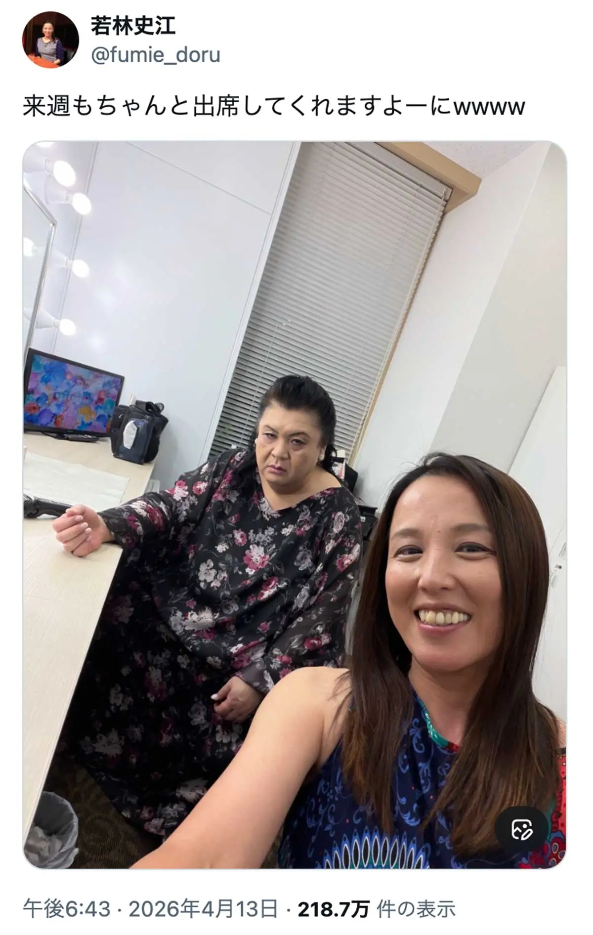 また、同番組で共演する株式評論家でタレントの若林史江(48)が放送後、自身のXに《来週もちゃんと出席してくれますよーにwwww》とのコメントとともに、楽屋でのマツコとのツーショット写真を投稿。ところが、写真のマツコは、光の加減もあってか、目の下やほうれい線、顎のラインが黒く影になっていたため、さらに心配する声で溢れた。