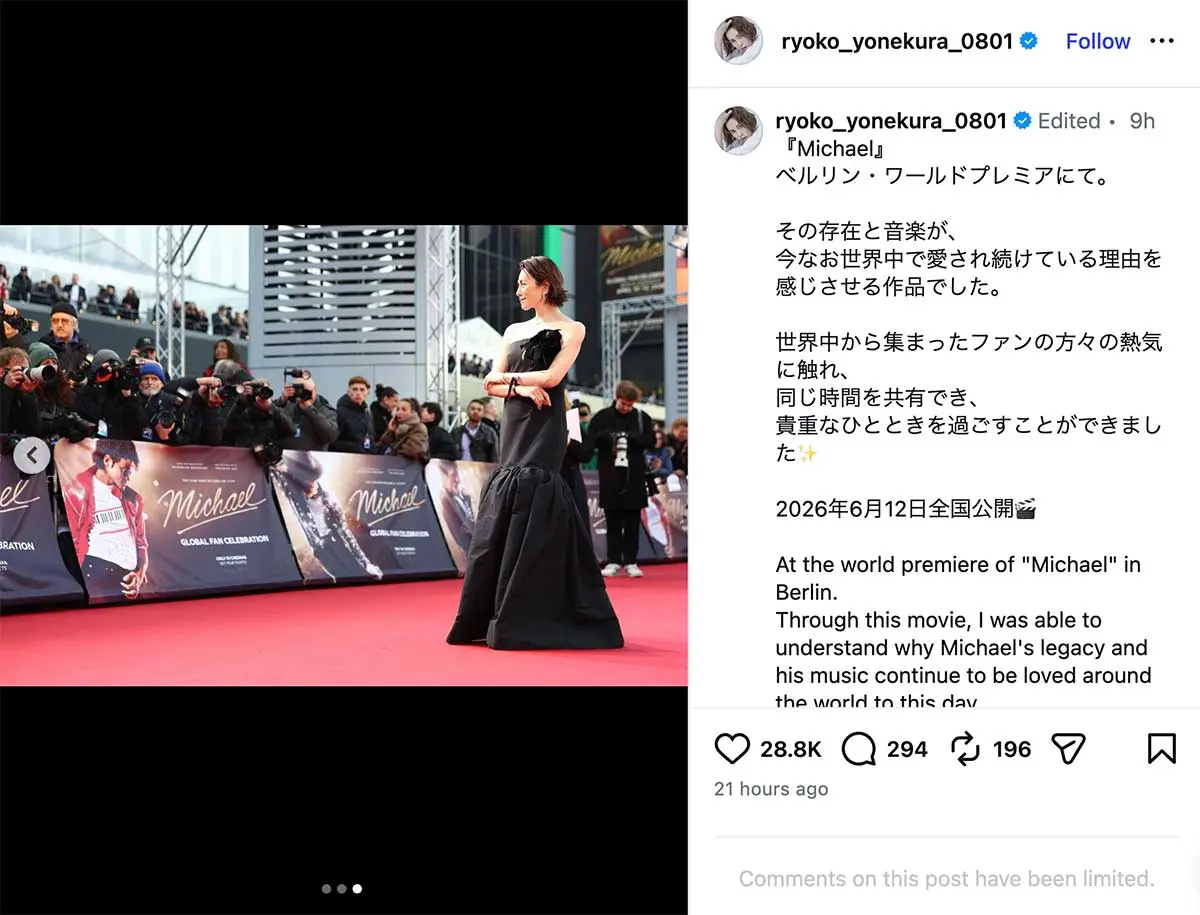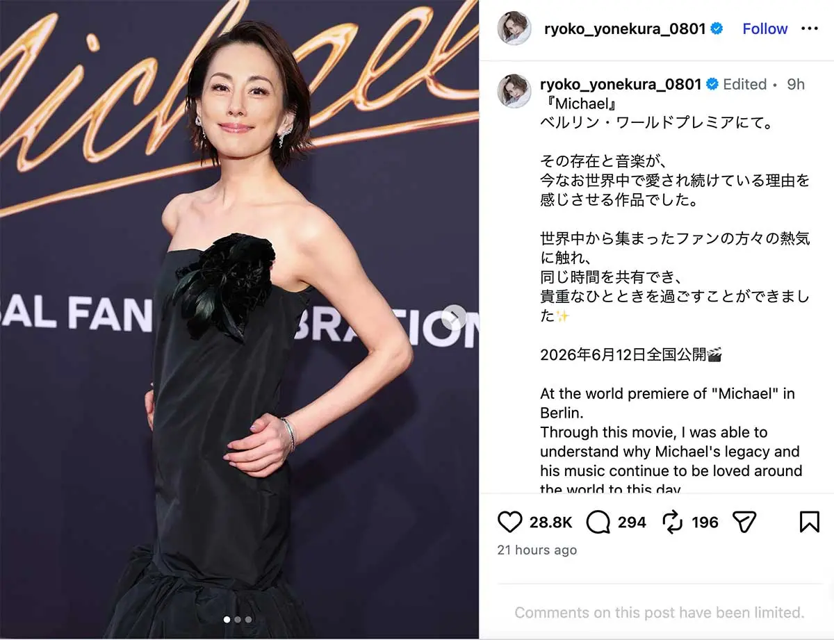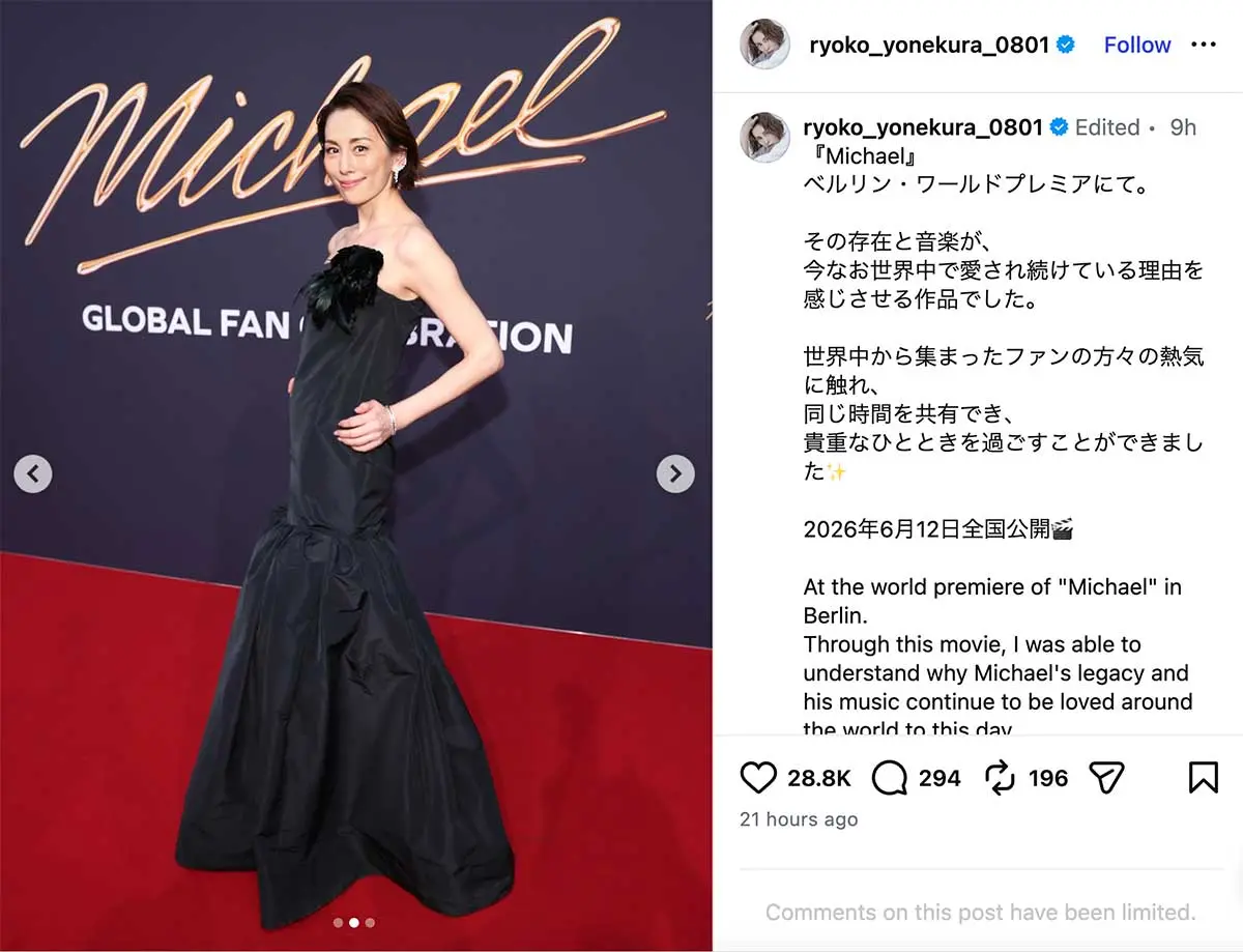 「痩せすぎ」「大丈夫?」と心配の声があがった米倉涼子の黒ドレス姿(米倉涼子のインスタグラムより)