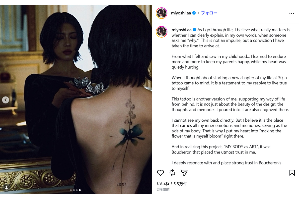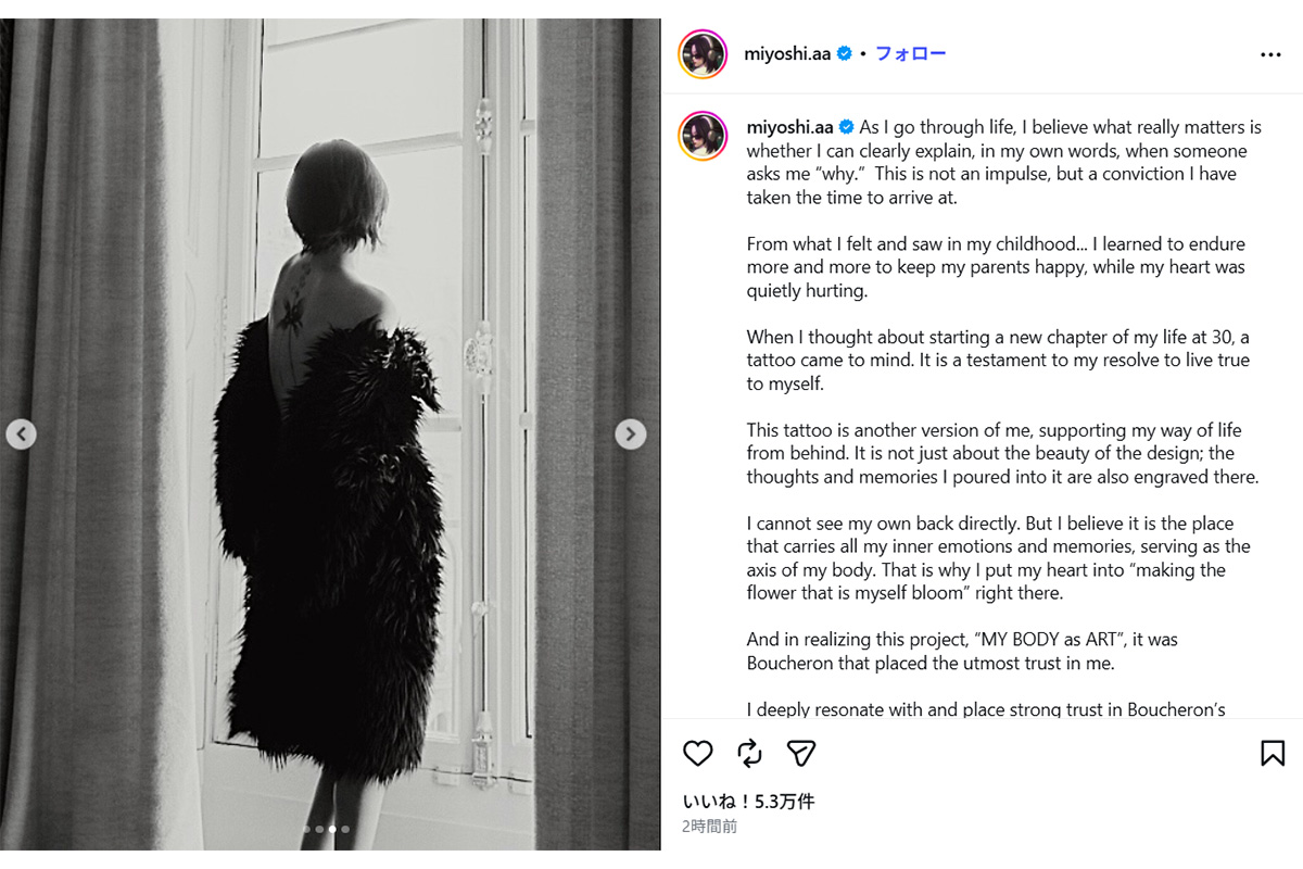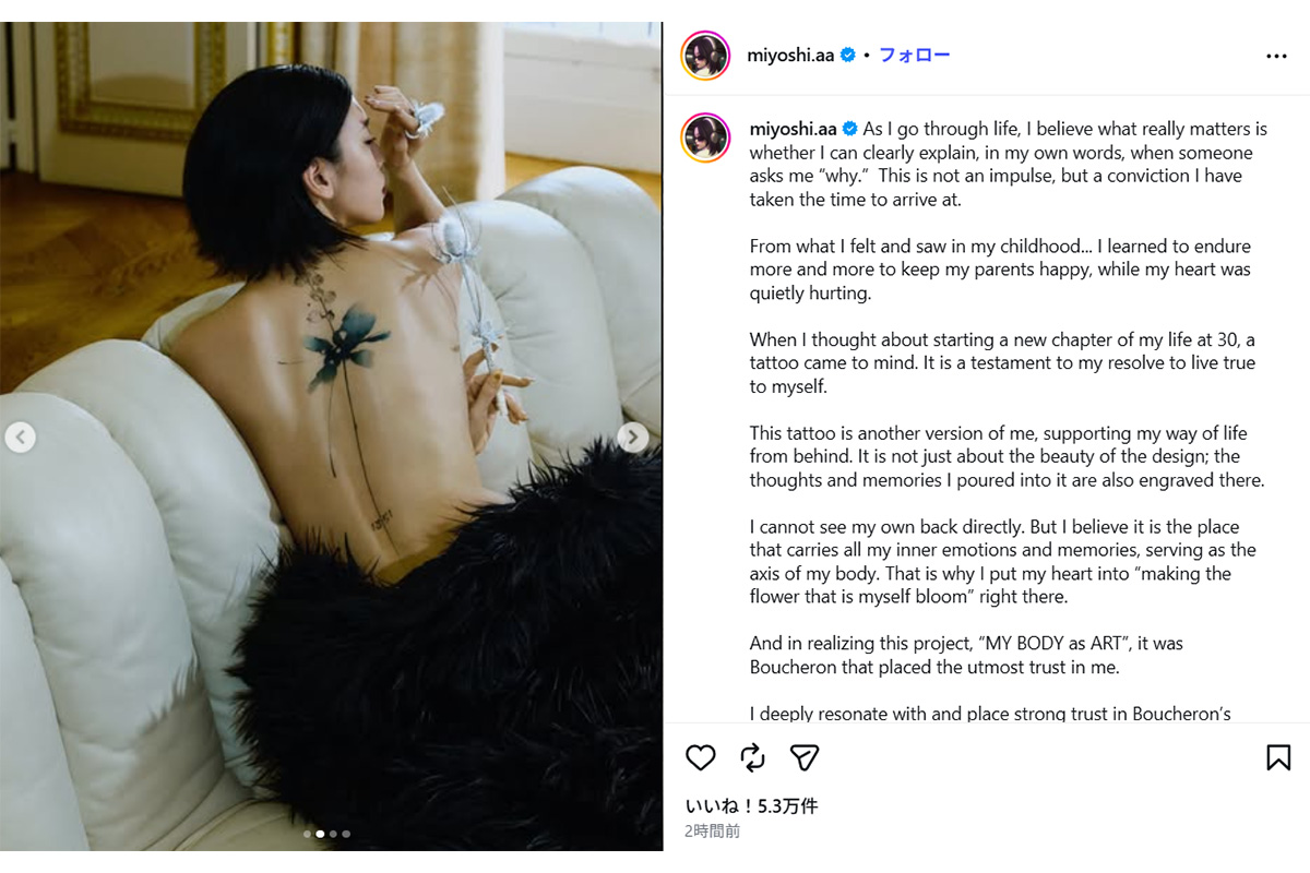 女性自身TOP > 芸能 > エンタメニュース > モデル・インフルエンサー > 三吉彩花 > 《腰から背中、肩まで…》三吉彩花 “ガッツリ”タトゥーを入れた理由「ないほうが断然素敵」強い拒否反応も 《腰から背中、肩まで…》三吉彩花 “ガッツリ”タトゥーを入れた理由「ないほうが断然素敵」強い拒否反応も 記事投稿日:2026/04/20 18:55 最終更新日:2026/04/20 18:55 『女性自身』編集部 三吉彩花(写真:本誌写真部) 20日までにモデル・女優の三吉彩花(29)が自身のインスタグラムを更新。全文英語での投稿だったのだが、ともにアップした三吉の“激変”写真が物議を醸していて――。「三吉さんは、ハイジュエリーブランド『ブシュロン』を身に着け、背中が開いた黒いドレス姿の写真を投稿したのですが、そのざっくり見えた背中にタトゥーが刻まれていたんです。腰から背中の中央を通り、肩までと広範囲に及ぶ“... 記事の続きを読む 出典元:WEB女性自身 【関連画像】 【関連記事】 【写真あり】「タトゥーいれたの!?」人気モデルのインスタ投稿に「二度見したわ!」と驚きの声 【写真あり】「あの別れ方のイメージ消えない」竹内涼真 三吉彩花との破局報道に辛辣声…尾を引く“乗り換え愛”報道 【写真あり】堀北真希 茶髪ショートに…親子3人の休日で見せた激変の今 関連カテゴリー: 芸能 エンタメニュース 関連タグ: タトゥーモデル・インフルエンサー三吉彩花 こちらの記事もおすすめ 芸能 もっと見る 「威圧感しかない」“元おはガール”タレント(39) 大手寿司チェーン店でのタ... 2026/04/20 19:30 エンタメニュース 「どんな基準なの?」中丸雄一『脱力タイムズ』出演シーンがFOD、Netfli... 2026/04/20 19:25 エンタメニュース 米倉涼子 騒動から半年消息不明…アルゼンチン人恋人の「衝撃近影」と「現れた場... 2026/04/20 19:05 エンタメニュース 《腰から背中、肩まで…》三吉彩花 “ガッツリ”タトゥーを入れた理由「ないほう... 2026/04/20 18:55 エンタメニュース 「誰も同情なんてしない」前山剛久 SNS再開で「5kg痩せた」「光が辛い」と... 2026/04/20 18:30 エンタメニュース 《実はガッツリ入っている》手越祐也 『イッテQ』出演時の“服装”に透ける日本... 2026/04/20 18:05 エンタメニュース 人気タグ モナキ大野智坂口杏里BENIaespa200万円2LDKCMソングbillboard JAPAN20世紀ASKABUMP OF CHICKEN カテゴリー 芸能 エンタメニュースインタビュー 皇室国内海外 海外ニュース韓流ニュース スポーツライフ 美容健康暮らしグルメ コミックコラム占い