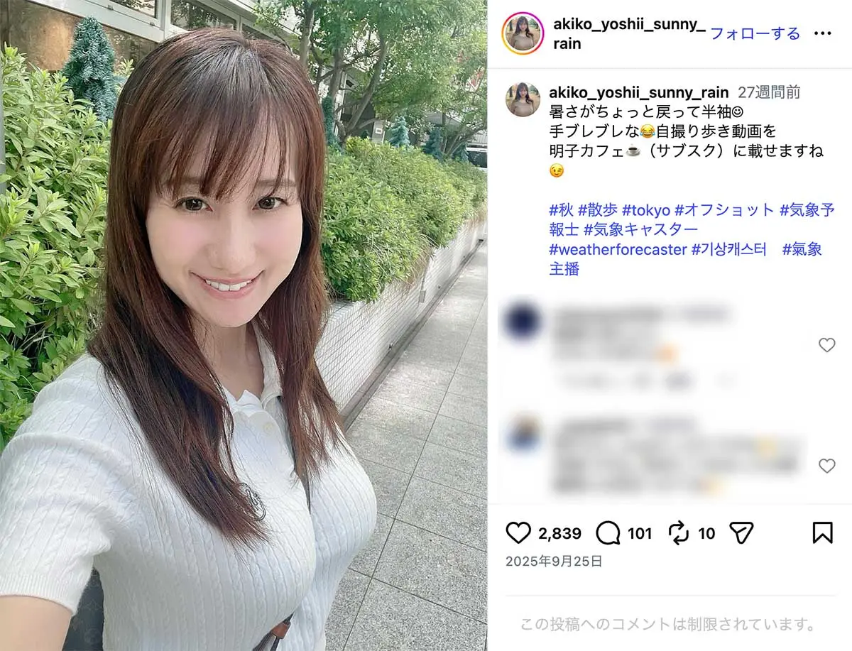 女性自身TOP > 芸能 > エンタメニュース > 芸能全般 > 吉井明子 > 「すでに声がかかっている」関係者証言…NHK出演の45歳“グラマラス”気象予報士 グラビアデビュー間近か > 「すでに声がかかっている」関係者証言…NHK出演の45歳“グラマラス”気象予報士 グラビアデビュー間近かの画像・写真3枚目 「すでに声がかかっている」関係者証言…NHK出演の45歳“グラマラス”気象予報士 グラビアデビュー間近か 記事投稿日:2026/04/22 10:55 最終更新日:2026/04/22 12:27 吉井明子のインスタグラムより この写真の記事へ こちらの写真もおすすめ
