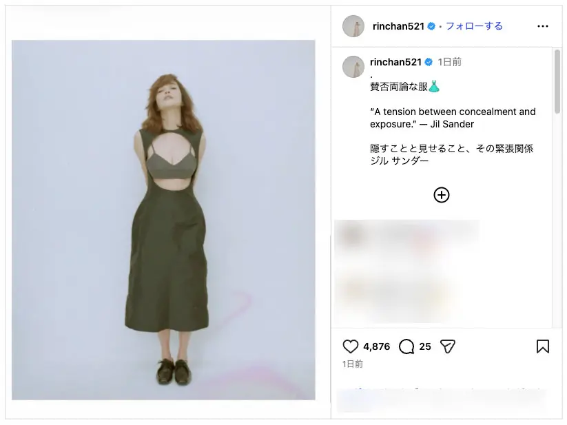 さらに投稿には《隠すことと見せること、その緊張関係》と衣装に込めた思いを示すメッセージも添えられており、コメント欄には