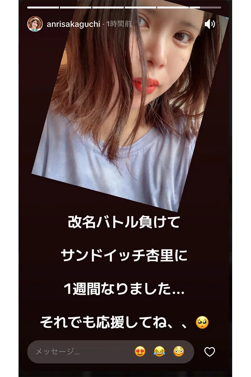 女性自身TOP > 芸能 > エンタメニュース > 芸能全般 > 坂口杏里 > 坂口杏里 配信仲間の“逮捕騒動いじり動画”に「公開処刑」とブチギレも…SNS企画で改名した“まさかの名前” 坂口杏里 配信仲間の“逮捕騒動いじり動画”に「公開処刑」とブチギレも…SNS企画で改名した“まさかの名前” 記事投稿日:2026/04/29 18:55 最終更新日:2026/04/29 18:55 『女性自身』編集部 坂口杏里(写真:本誌写真部) 3月17日に東京・八王子市のコンビニで約300円のサンドイッチ1個を万引きし、窃盗容疑で現行犯逮捕された坂口杏里(35)。ほどなくして釈放された後、4月8日に不起訴処分とされた。騒動は沈静化しつつあるが、語っていた“将来の夢”とはかけ離れた生活を送っているようで――。「杏里さんは釈放後に出演したYouTuberのインタビュー動画で、万引きをした動機などを語っていました。... 記事の続きを読む 出典元:WEB女性自身 【関連画像】 【関連記事】 【写真あり】「パンツがずれた」万引逮捕の坂口杏里 衝撃の近影…SNS動画で語った“将来の夢”と透ける金銭状況 【写真あり】バイきんぐ小峠 坂口杏里との破局決めた「千原ジュニアの一言」 【写真あり】坂口杏里 金銭苦でもすがれなかった「継父の厳しい懐事情」 関連カテゴリー: 芸能 エンタメニュース 関連タグ: TikTok坂口杏里改名芸能全般 こちらの記事もおすすめ 坂口杏里の最新記事 もっと見る 「パンツがずれた」万引逮捕の坂口杏里 衝撃の近影…SNS動画で語った“将来の... 2026/04/15 06:00 エンタメニュース 《長続きしない交際》万引逮捕の坂口杏里 ファン男性と同棲も…“継父”絶縁報道... 2026/04/07 18:00 エンタメニュース 《SOSから一転、ファンと同棲》万引逮捕の坂口杏里 “継父”尾崎健夫に身勝手... 2026/04/03 19:15 エンタメニュース 「本当に昔からやりたかった」坂口杏里 万引き逮捕で釈放後に「介護・保育」に意... 2026/04/01 16:40 エンタメニュース 《釈放時も迎えに行ってない》万引き逮捕の坂口杏里 尾崎健夫にSOSも…“断絶... 2026/04/01 11:00 エンタメニュース 「私のほうが面白い」と豪語…坂口杏里 逮捕前にライバル心を燃やしていた「ギャ... 2026/03/30 19:00 エンタメニュース 人気タグ 日村勇紀高市早苗AdoA.B.C-ZCNNBTS2020年100均グッズATSUSHIAIR[Alexandros]BOOWY カテゴリー 芸能 エンタメニュースインタビュー 皇室国内海外 海外ニュース韓流ニュース スポーツライフ 美容健康暮らしグルメ コミックコラム占い