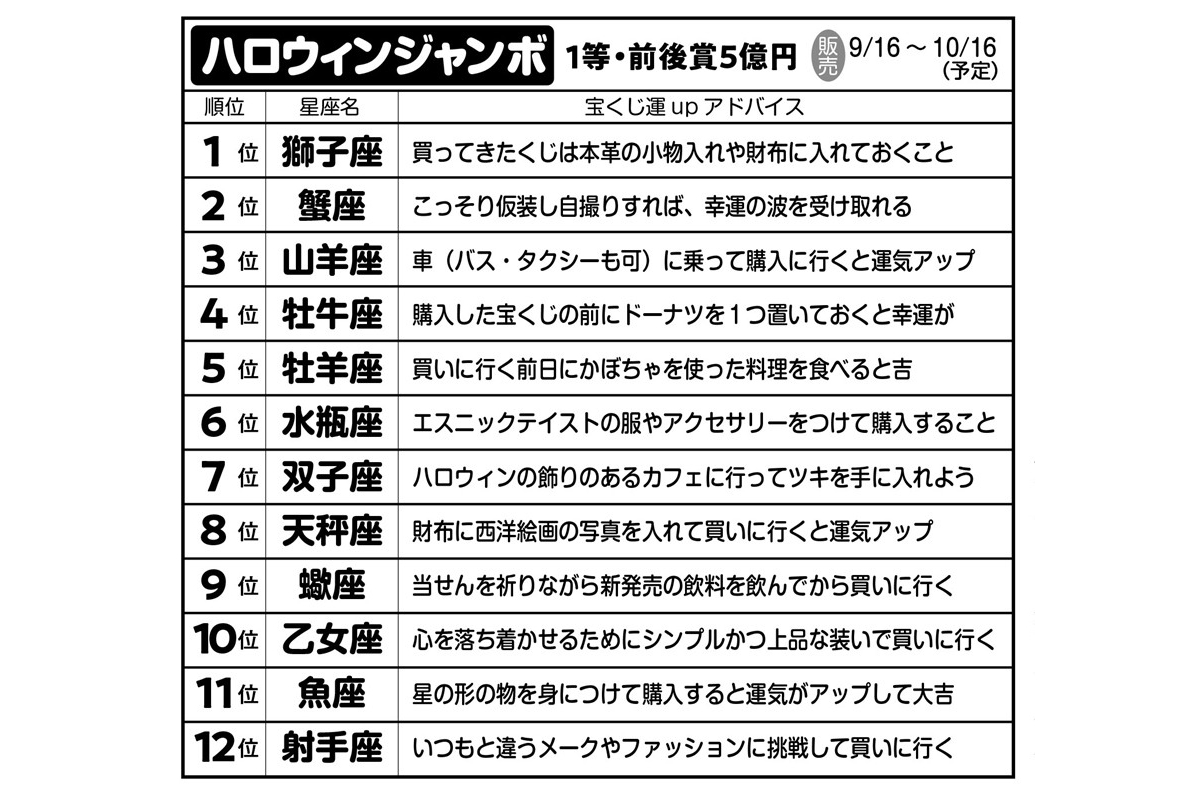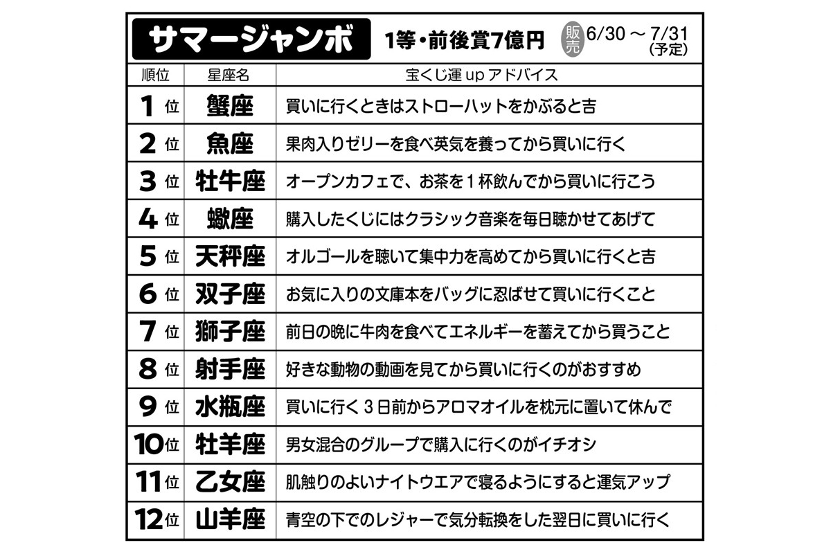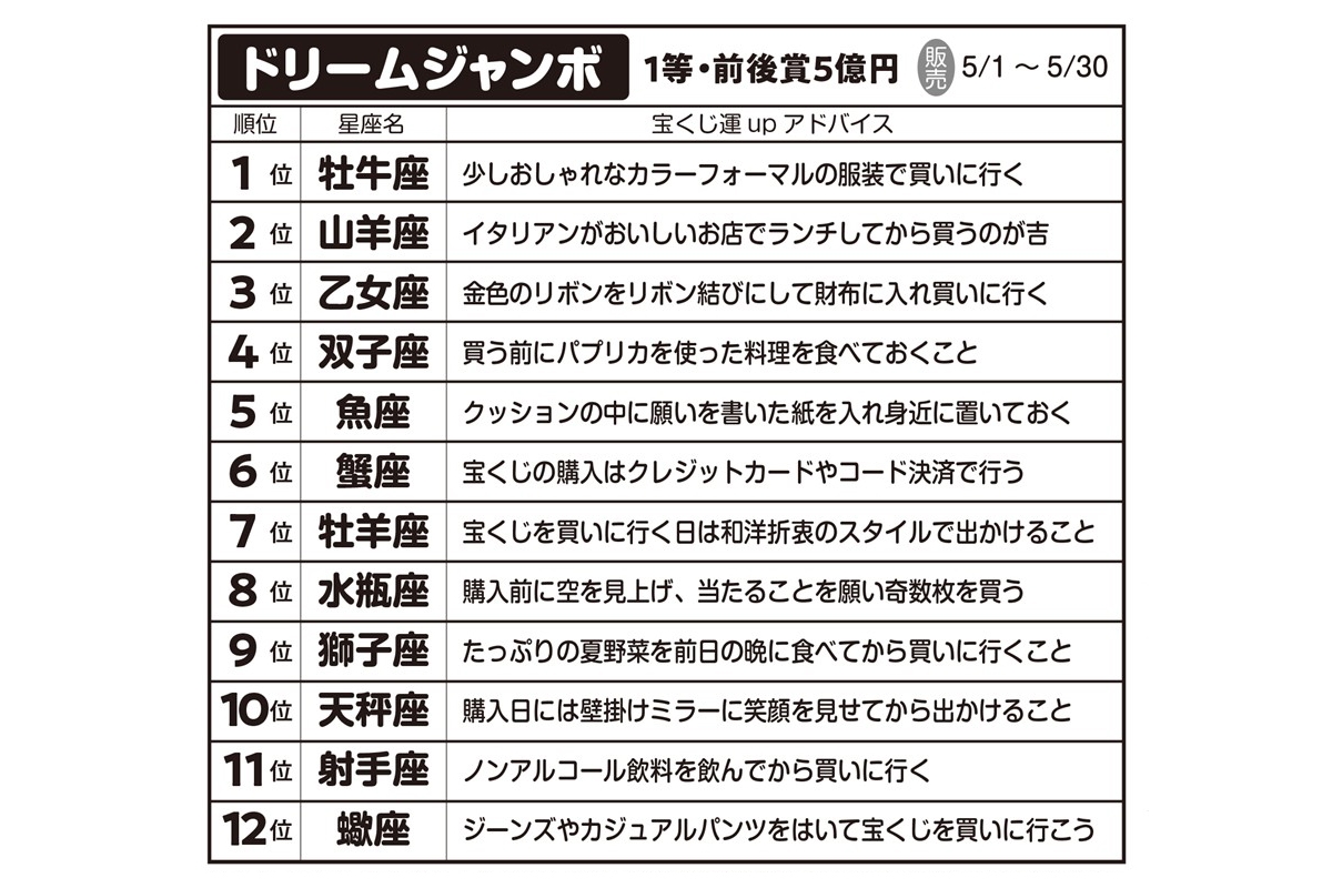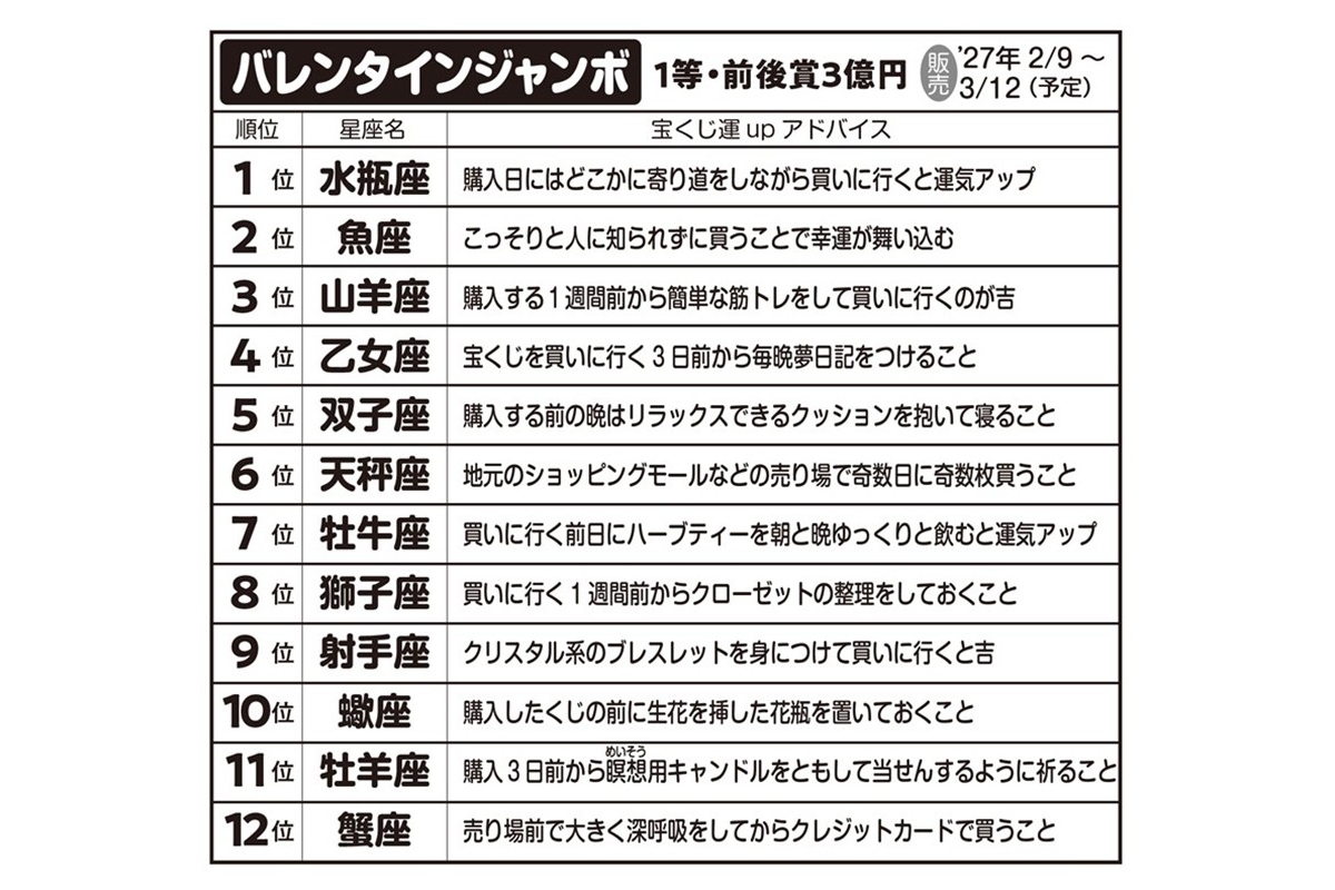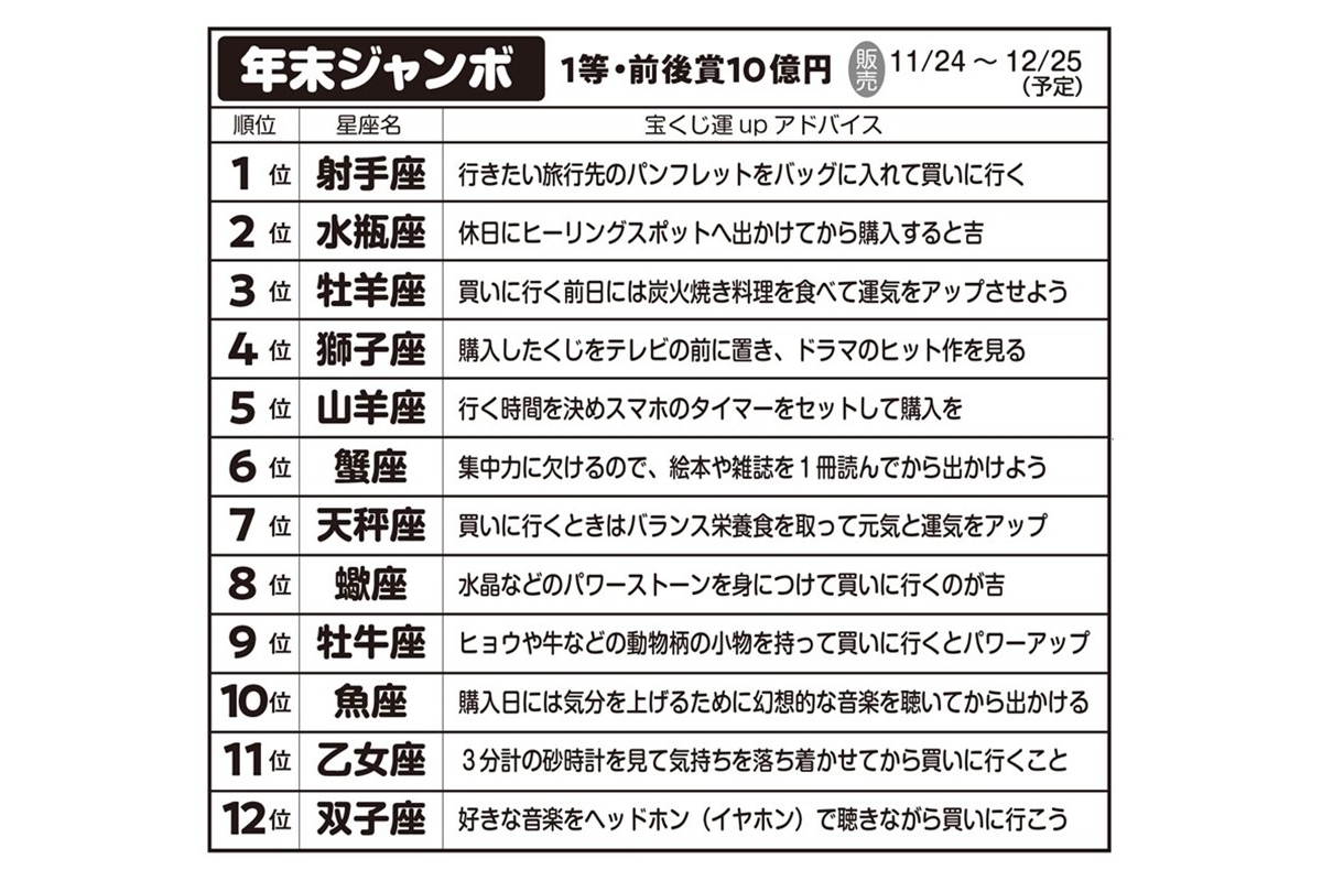 女性自身TOP > 占い > 宝くじ > 「2026年ジャンボ宝くじ」が当たる星座ランキング|人気開運アドバイザーが季節別に紹介 「2026年ジャンボ宝くじ」が当たる星座ランキング|人気開運アドバイザーが季節別に紹介 記事投稿日:2026/04/15 11:00 最終更新日:2026/04/15 11:00 『女性自身』編集部 西洋占星術にくわしい開運アドバイザーの御瀧政子さん 「約2600年ぶりに土星と海王星が牡羊座0度で重なる『ゼロポイント』が、2026年2月21日に発生したことをご存じでしょうか?」こう話すのは、西洋占星術にくわしい開運アドバイザーの御瀧政子さん。西洋占星術の12星座は1年間を牡羊座から最後の魚座までで360度周期を作っていて、最初の「牡羊座O度」は、宇宙の新年の始まりを意味するという。「この牡羊座O度で、土星と海王星とい... 記事の続きを読む 出典元:「女性自身」2026年4月21日・4月28日合併号 【関連画像】 【関連記事】 【星座ごとの解説あり】5大ジャンボ別12星座「宝くじ運」ランキング 【写真あり】血液型別「2026年宝くじが当たる財布」の特徴は?《血液型研究30年の開運アドバイザーが診断》 【写真あり】2026年宝くじが当たる「血液型×干支」億万長者ランキング《2位はB型×午年、1位は?》 関連カテゴリー: 占い 関連タグ: 億招き宝くじ星座 こちらの記事もおすすめ 占い もっと見る 「2026年ジャンボ宝くじ」が当たる星座ランキング|人気開運アドバイザーが季... 2026/04/15 11:00 占い 真木あかりの12星座占い【4/9~4/22】かに座は周囲の期待に応えられそう 2026/04/09 06:00 占い 真木あかりの12星座占い【4/2~4/8】おとめ座は気ぜわしい日々でも見極め... 2026/04/02 06:00 占い 『美人占花』の蝦名里香がお届けする「今すぐ幸せを掴む開運法」【4月前半】 2026/04/01 06:00 占い 【4月の運勢】毎日の家事が楽しみになる!湊きよひろの「金運爆上げ」掃除術 2026/04/01 06:00 占い 真木あかりの12星座占い【3/26~4/1】うお座は個性やアイデアを存分に活... 2026/03/26 06:00 占い 人気タグ 蒼井そら山本裕典モナキ2NE1Acid Black Cherry50セント83年組AndroidCLUB PRINCEBreaking DownADHDATSUSHI カテゴリー 芸能 エンタメニュースインタビュー 皇室国内海外 海外ニュース韓流ニュース スポーツライフ 美容健康暮らしグルメ コミックコラム占い