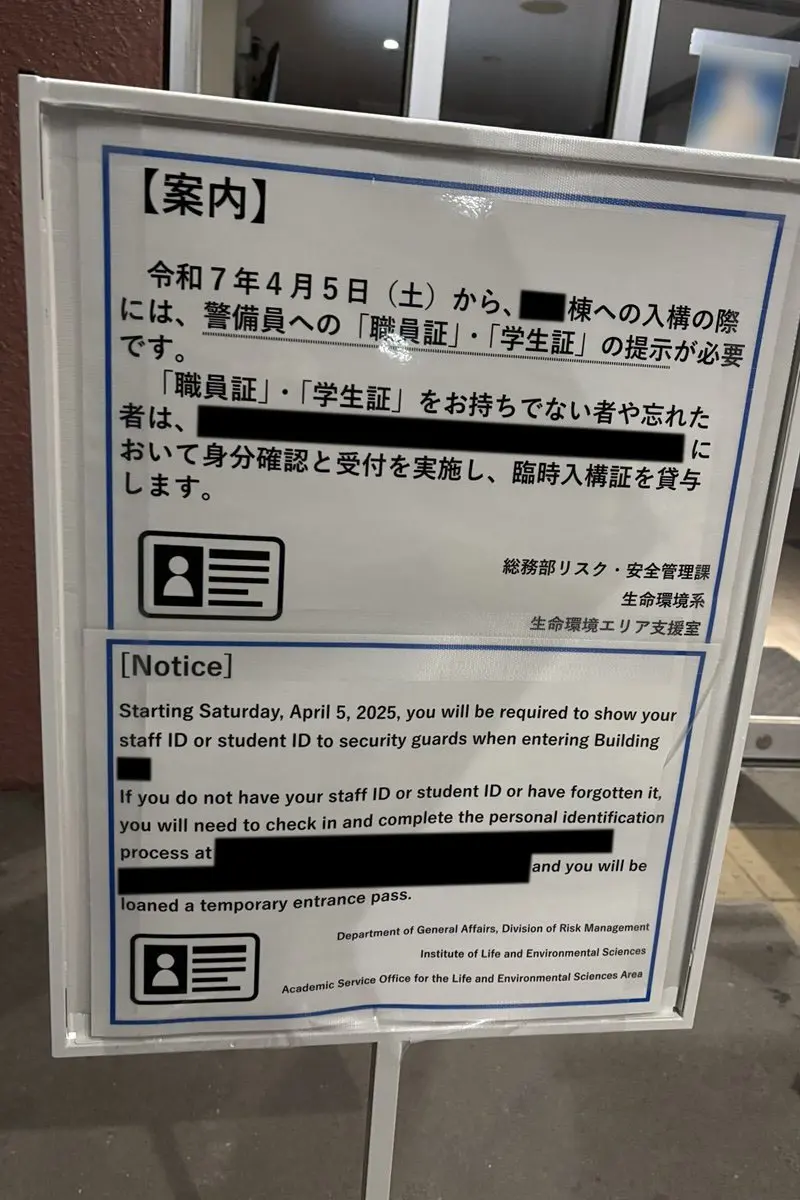 《本学リスク・安全管理課より、本学のセキュリティ確保の観点から、令和7年4月より、一部の建物(第二エリア内の入構制限を実施する建物)において、入構時に学生証・職員証を提示することになりました。ついては、学内移動をする際には、学生証の携行をするようにしてください》