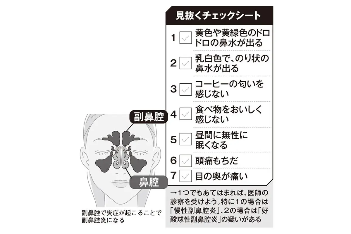適切な治療を受けない場合、髄膜炎の致死率は50%。甘く見ていると命にかかわることがあるのだ。副鼻腔炎なのに、単なる鼻炎や鼻づまりと思って放置している人も多い。自分が“隠れ副鼻腔炎”でないか、下のチェックリストで確かめよう。予防法はあるの?