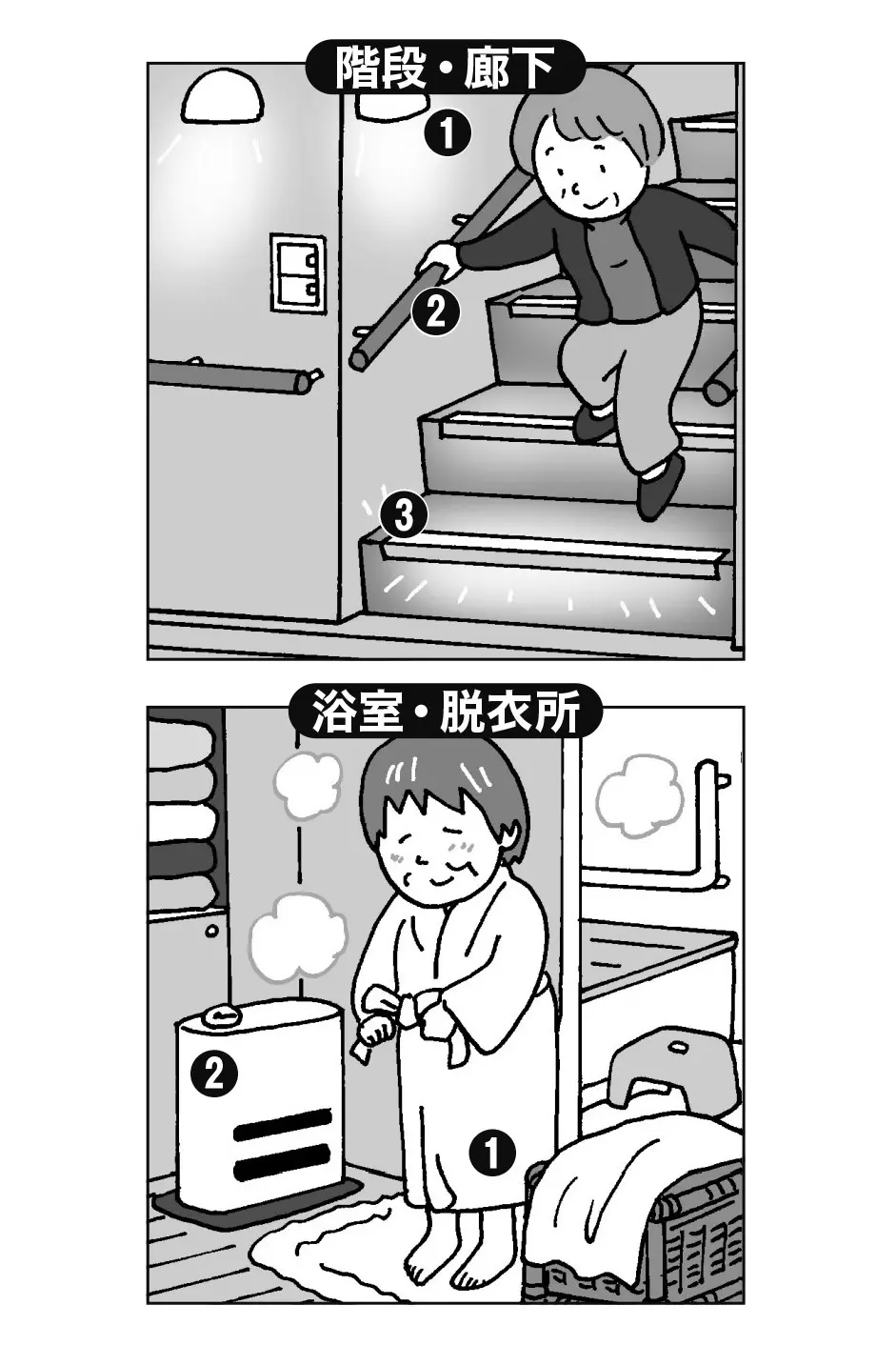 「床とカーペットやラグの段差によるつまずきを防ぐために、養生テープなどで端部を固定して段差を減らします。そしてスリッパを履いての移動はつまずきの原因にもなるので、かかと付きの室内用の「転倒予防シューズ」に切り替えましょう」((1)・イラスト内の番号を参照。コメントは国崎さん、以下同)
